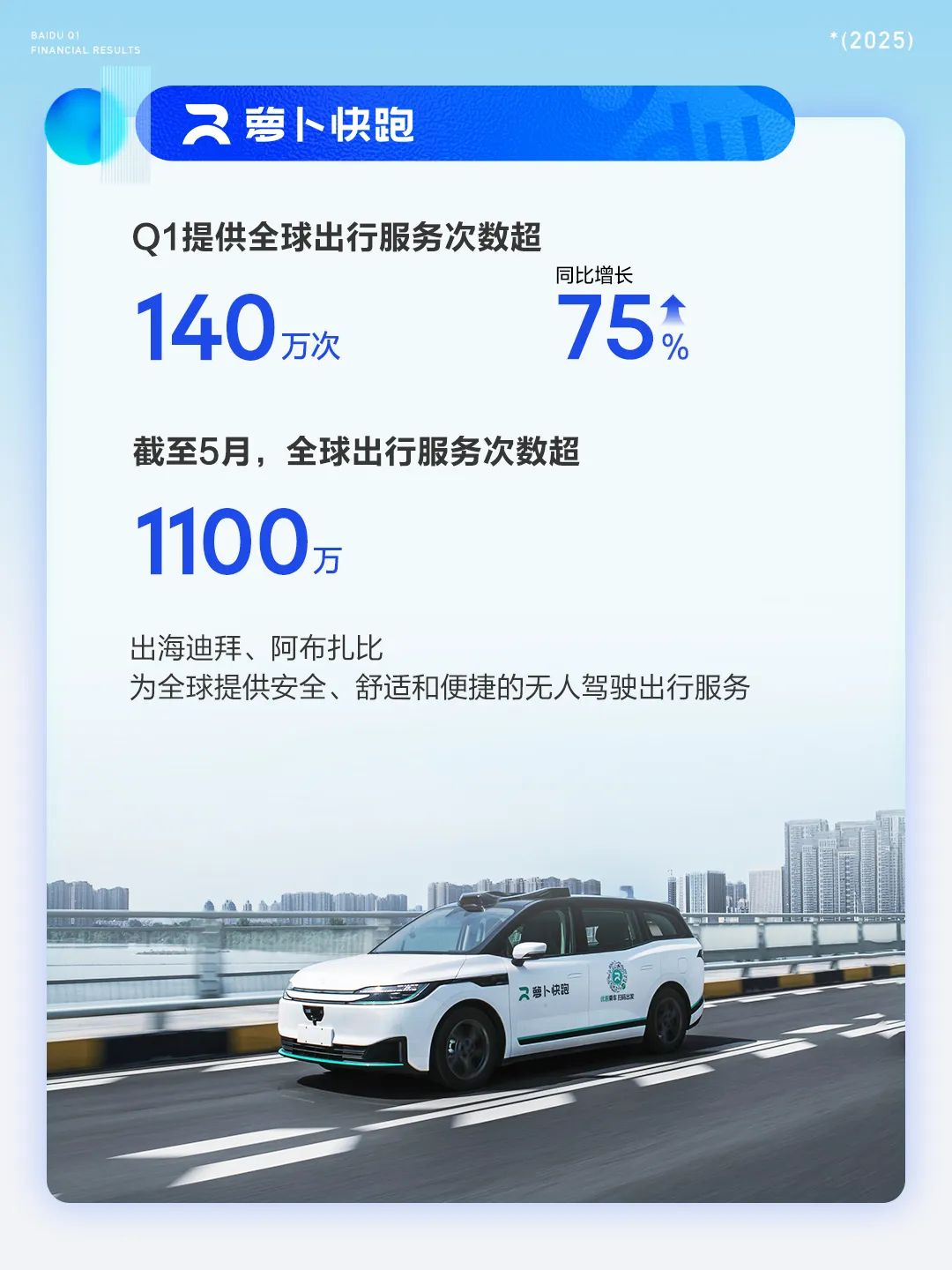 IT之家注意到,数据显示,2025 年第一季度,萝卜快跑提供的自动驾驶订单超过 1.4 亿单,同比增长 75%。截至 2025 年 5 月,萝卜快跑累计为公众提供的自动驾驶出行服务订单超过 11 亿单。