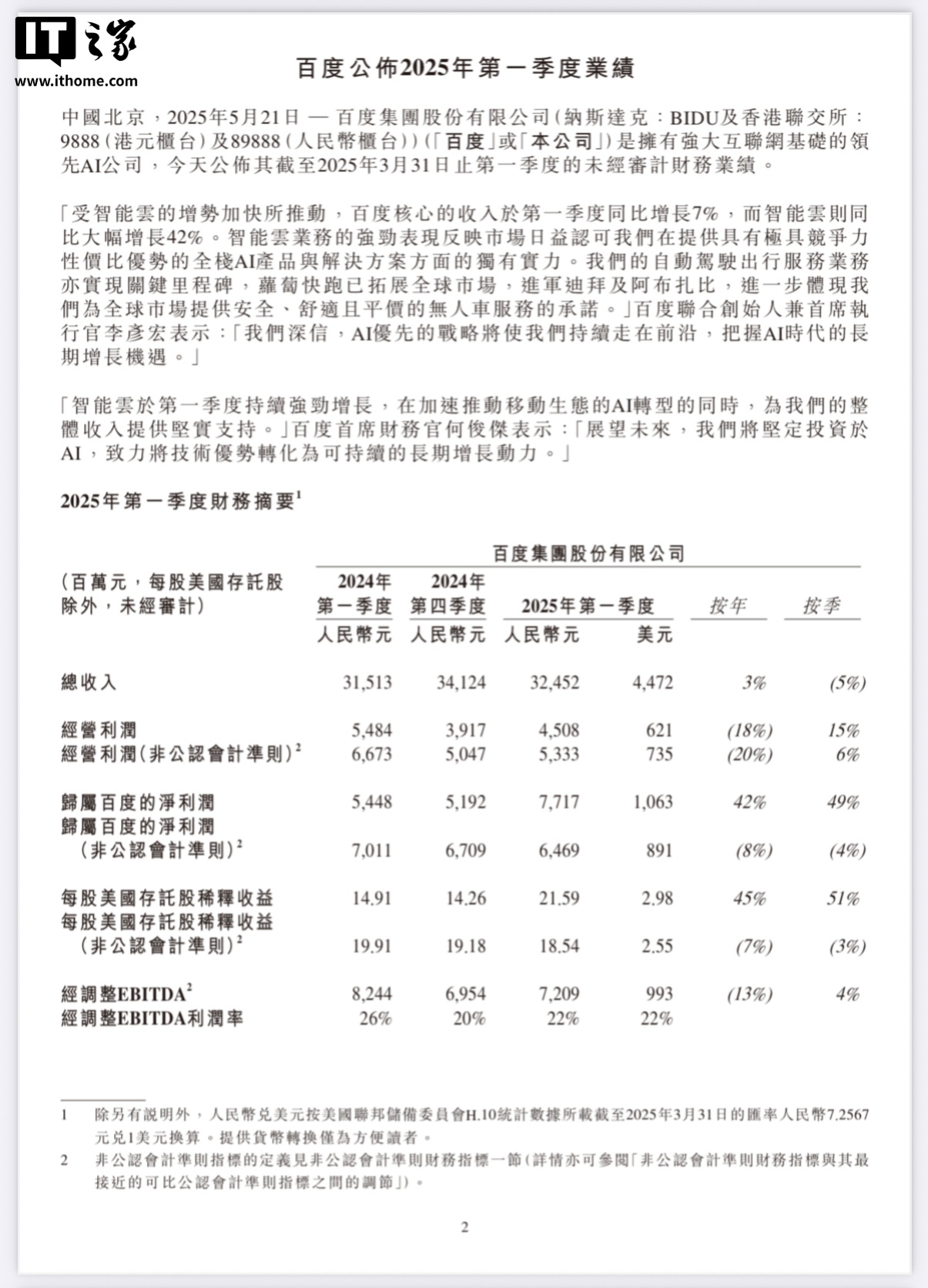 IT之家 5 月 21 日消息,百度今日发布了截至 3 月 31 日的 2025 年第一季度财报:总营收为 325 亿元,同比增长 3%。调整后营业利润 53.3 亿元,预估 48.9 亿元。调整后 EBITDA 为 72 亿元人民币(9.93 亿美元),调整后 EBITDA 利润率为 22%。百度核心的调整后 EBITDA 为 67 亿元人民币(9.25 亿美元),百度核心的调整后 EBITDA 利润率为 26%。百度集团称一季度 NON-GAAP 净利润 64.7 亿元,同比降 8%。百度第一季度研发费用为 45 亿元人民币(6.26 亿美元),同比下降 15%,主要是由于人员相关费用的减少。
