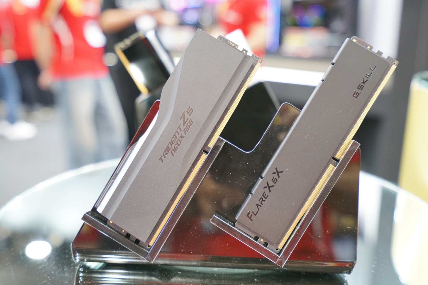 其中在 Trident Z5 NeoX RGB 上,芝奇展出了拥有类似更高等级产品皇家戟上“皇家钻彩”导光条设计的内存条,其散热马甲主体则有着细碎反光。灰色马甲的 Trident Z5 NeoX RGB 和 Flare X5X 内存也同步登场。