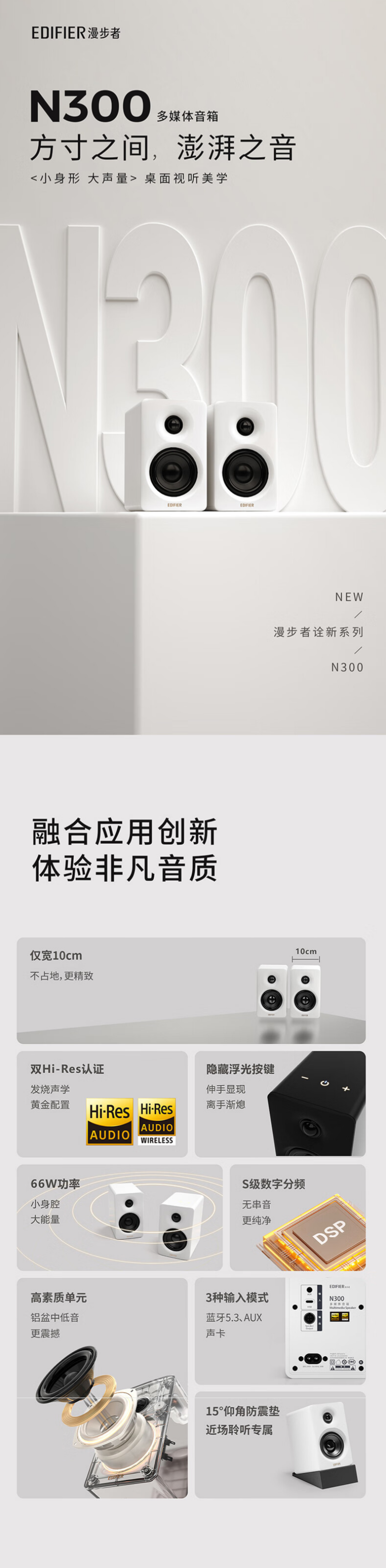 漫步者有源桌面音箱 N300 去年 5 月中旬开售,主打“双 Hi-Res(Hi-Res 和 Hi-Res 无线)认证”,上市定价 749 元。