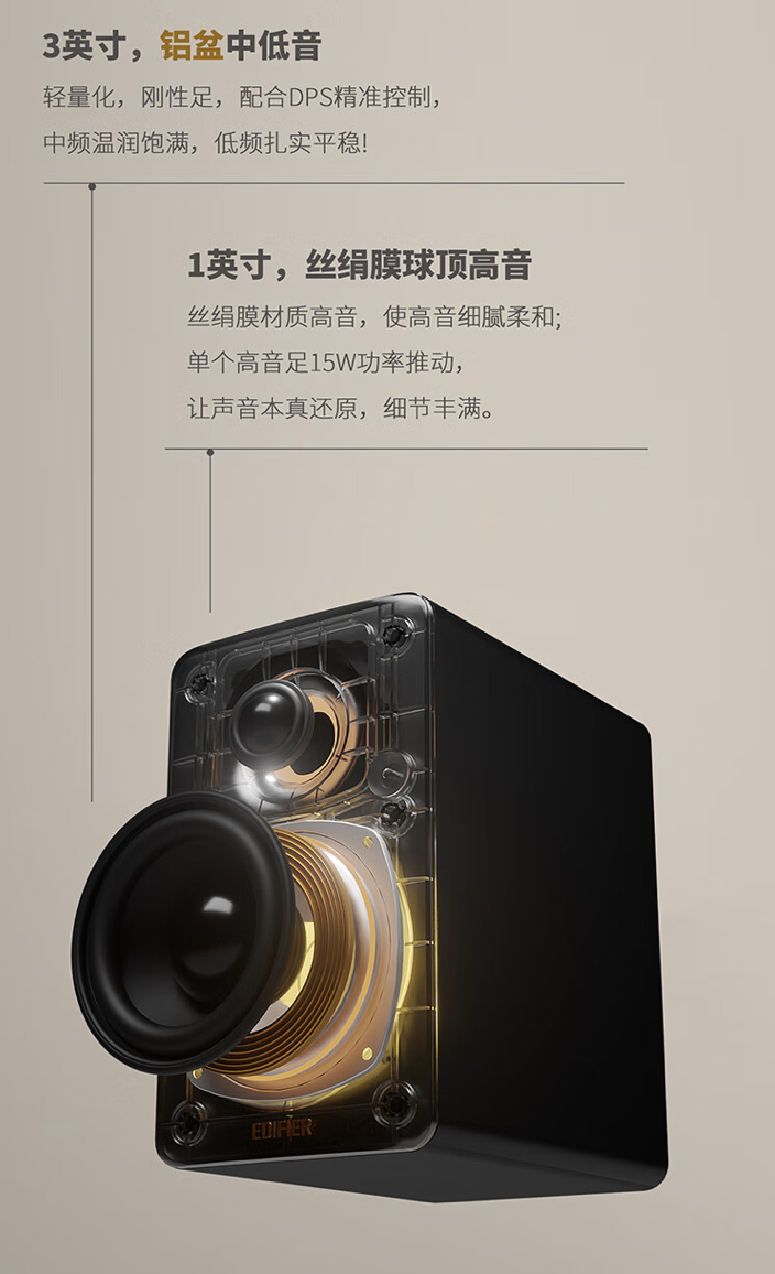 其功率达到 66W,搭配双功放独立驱动,号称具备越级声学配置,下潜深度为 58Hz,配有 1 英寸丝绢膜高音、3 英寸铝盆中低音。