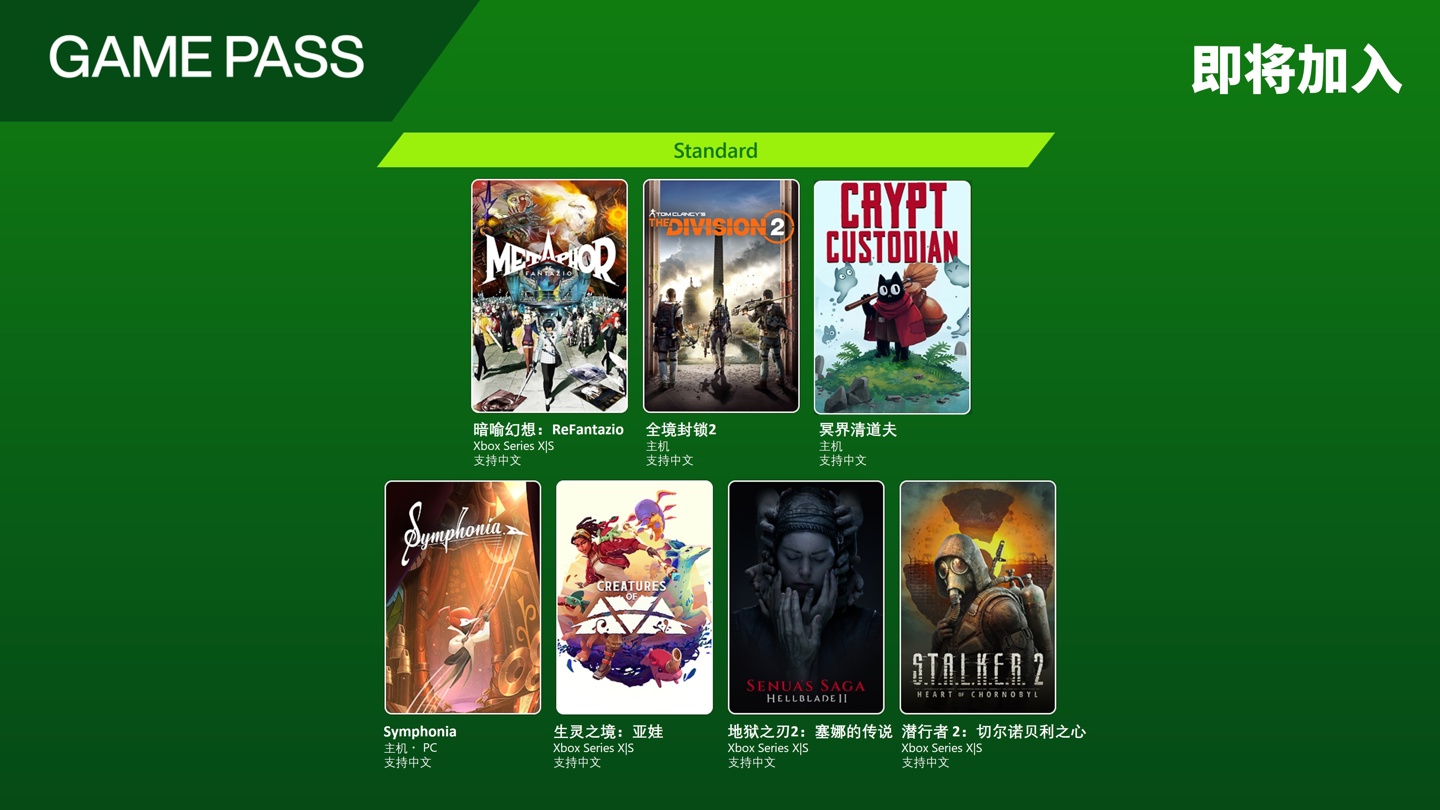另外,《暗喻幻想:ReFantazio》《全境封锁 2》《冥界清道夫》《Symphonia》《生灵之境:亚娃》《地狱之刃 2:塞娜的传说》《潜行者 2:切尔诺贝利之心》即将加入 Game Pass Standard。