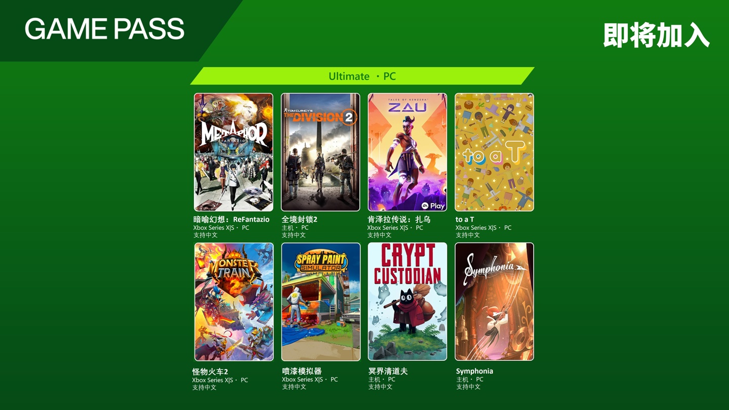 IT之家 5 月 21 日消息,微软 Xbox 官微今日宣布,《暗喻幻想:ReFantazio》《全境封锁 2》《肯泽拉传说:扎乌》《to a T》《怪物火车 2》《喷漆模拟器》《冥界清道夫》《Symphonia》即将加入 Game Pass Ultimate・PC。