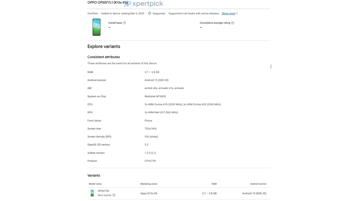 IT之家 5 月 22 日消息,科技媒体 xpertpick 昨日(5 月 21 日)发布博文,报道称 OPPO K13x 5G 手机现身 Google Play Console 列表的,该机搭载联发科天玑 6300 芯片,配备 4GB 内存,运行安卓 15 系统。
