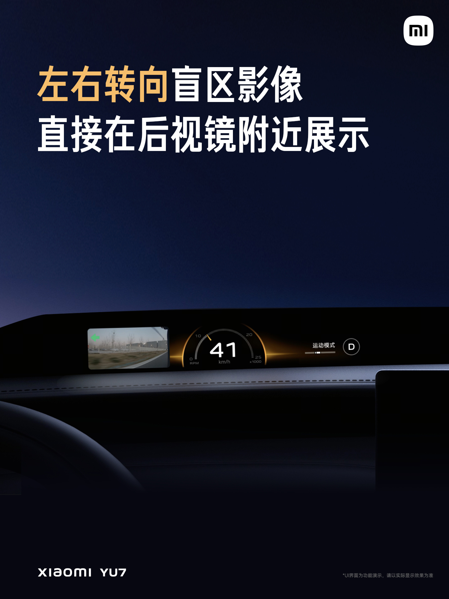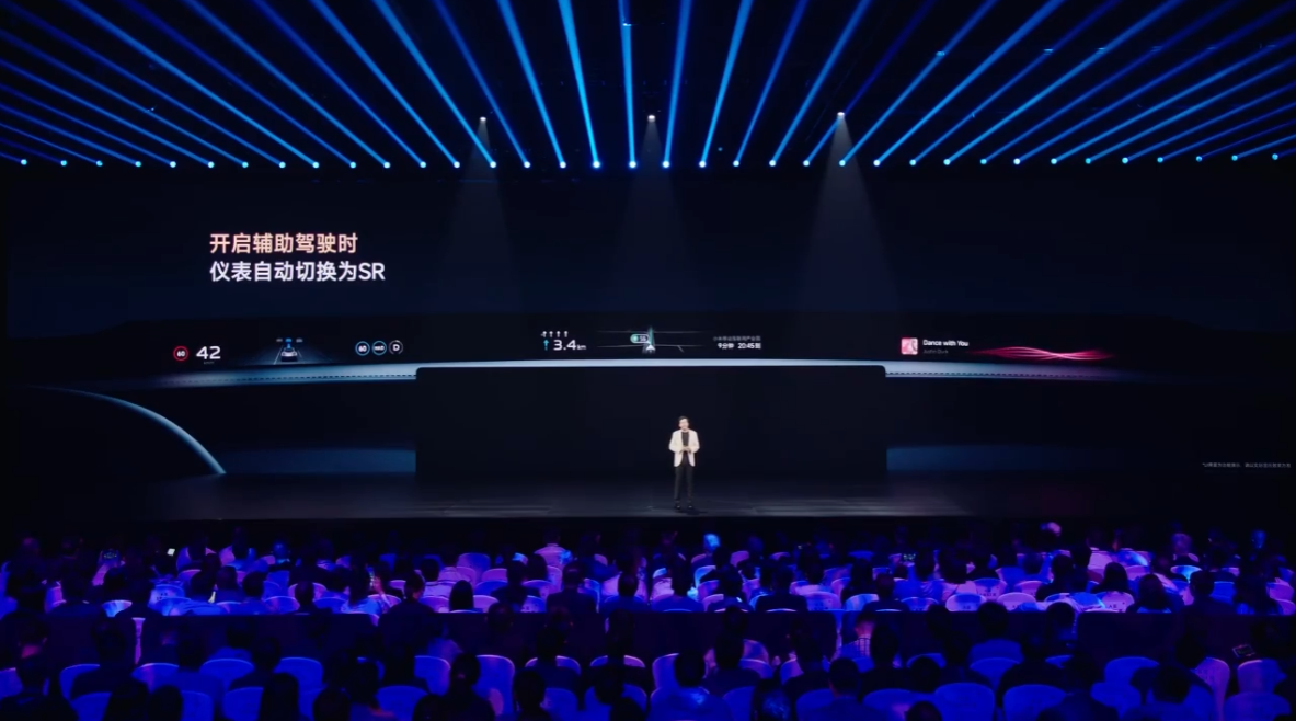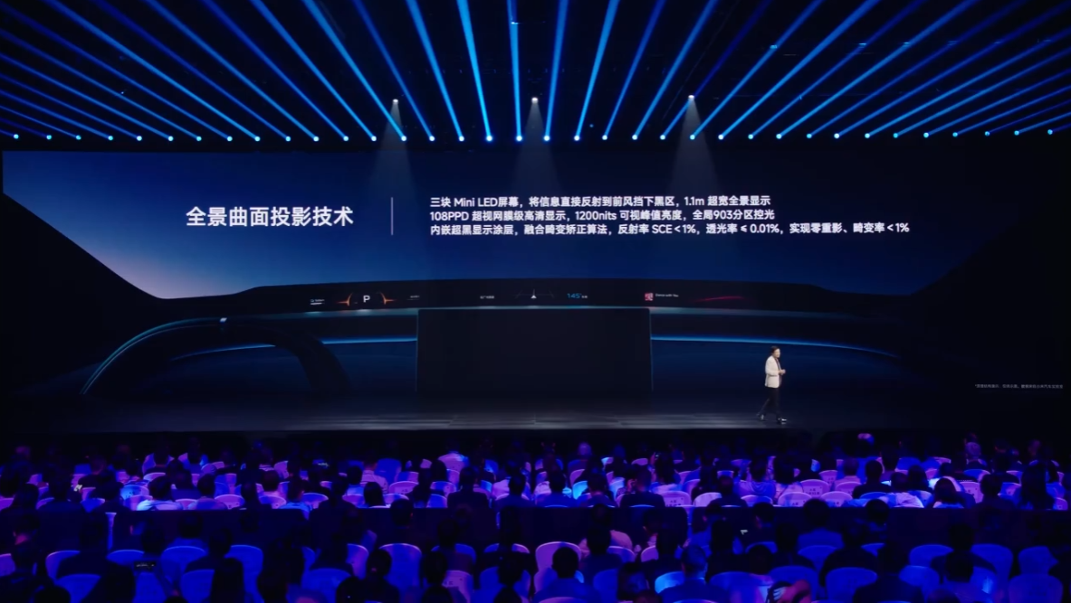 据介绍,“天际屏”采用了 3 块 Mini LED 屏幕,支持 1.1m 超宽全景显示、108PPD 超视网膜级高清显示,借助曲面投影技术可反射到前风挡下的黑区。具体功能上,主驾显示关键信息,副驾区域则可显示音乐卡片等娱乐信息。在开启辅助驾驶后,仪表还会自动启动 SR 功能;左右转向还支持显示盲区影像。
