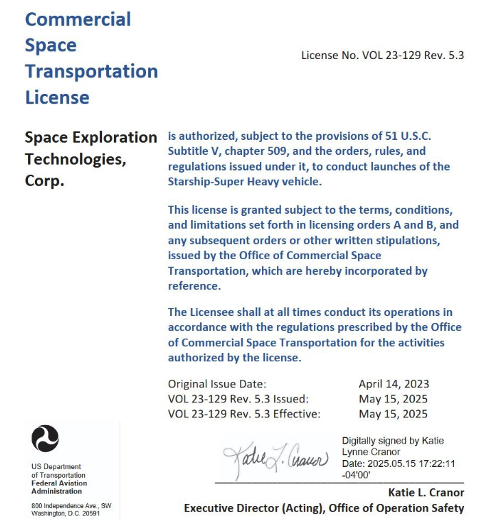 IT之家 5 月 23 日消息,历时 77 天后,美国联邦航空管理局(FAA)昨晚宣布完成对 SpaceX 星舰第八次试飞(IFT-8)的安全审查,正式批准该公司开展星舰第九次轨道级测试飞行。