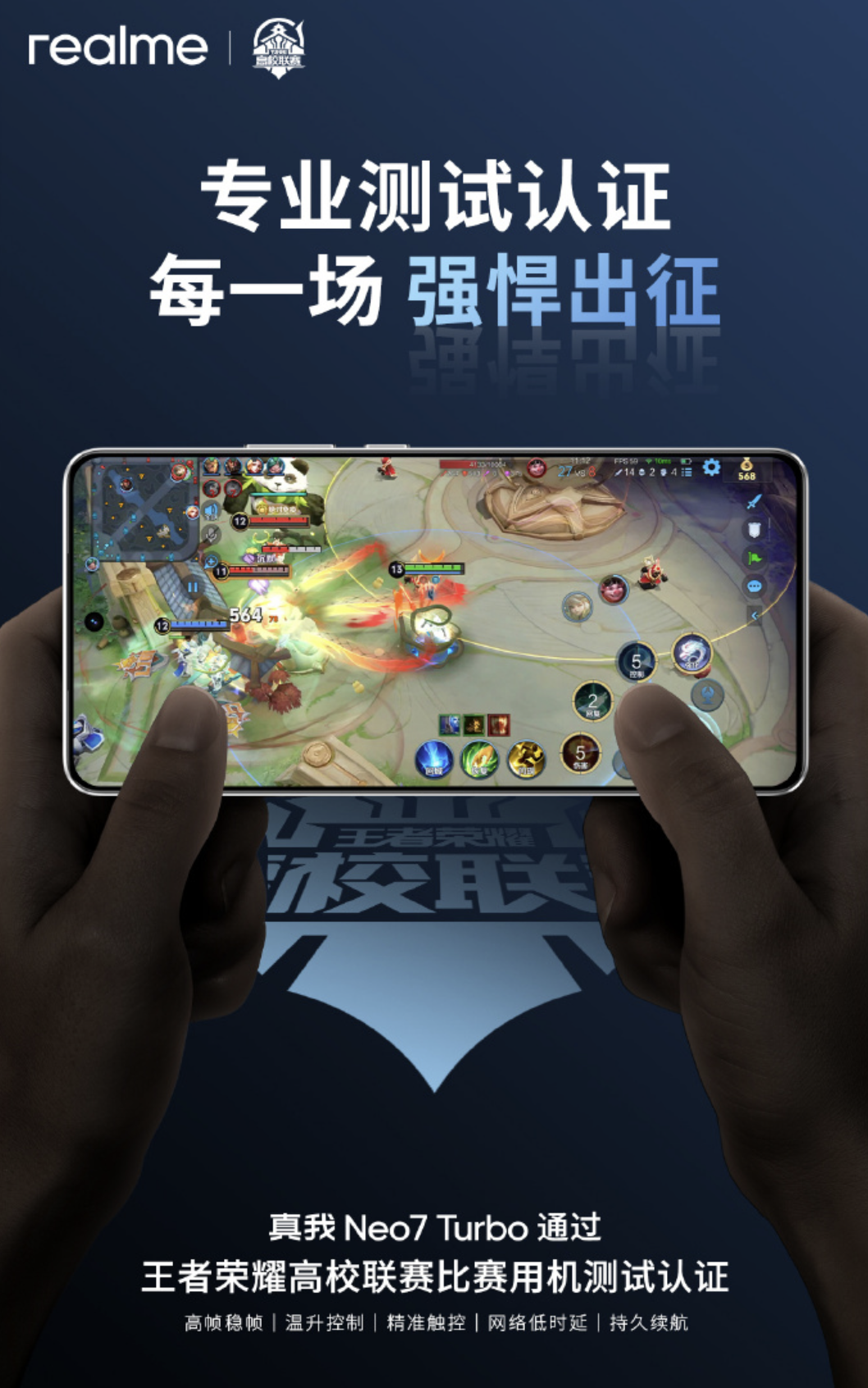 IT之家 5 月 23 日消息,真我手机官方微博今天对即将在 5 月 29 日发布的 realme 真我 Neo7 Turbo 手机进行预热,强调该机电竞方面表现,通过《王者荣耀》高校联赛比赛用机测试认证。