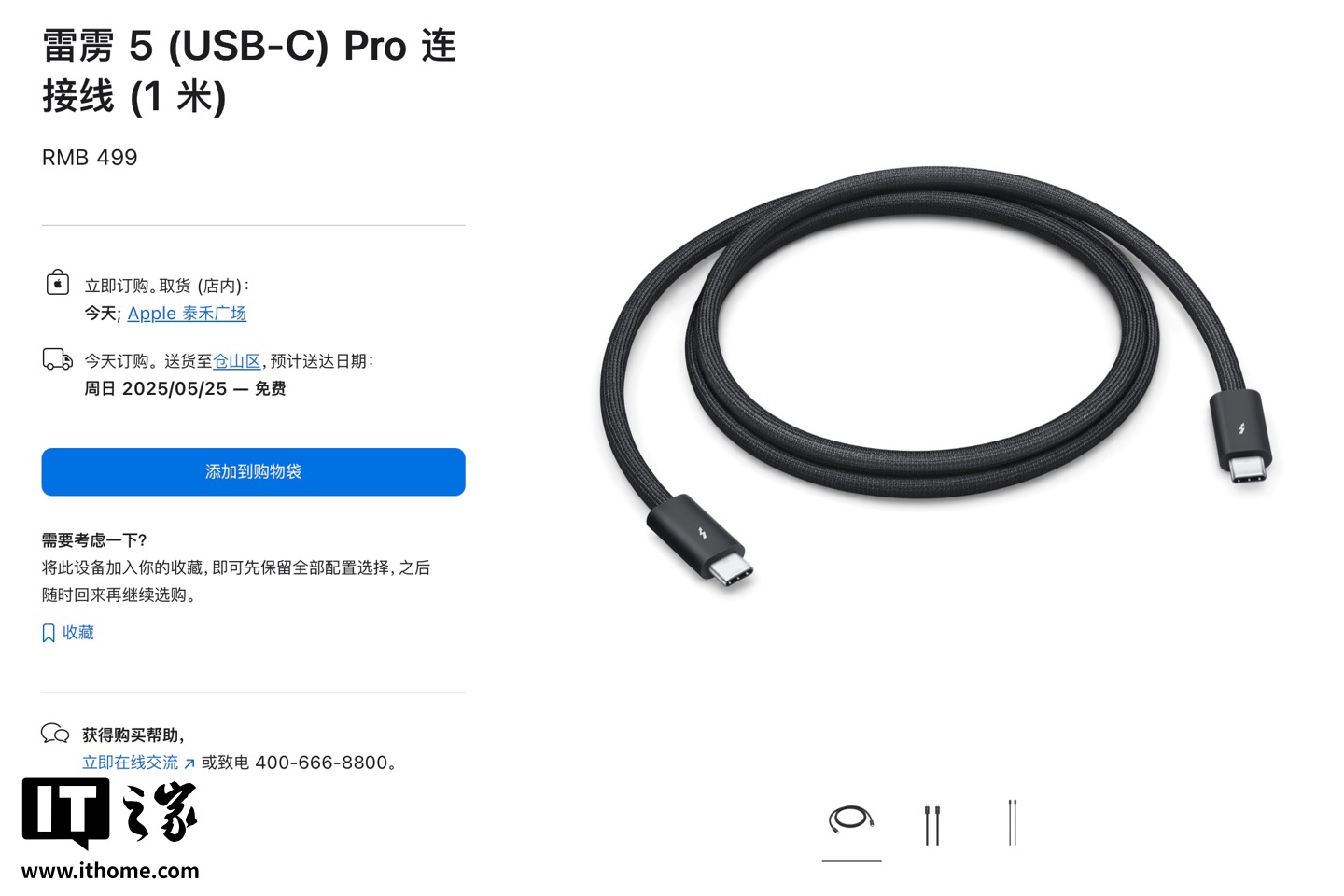 IT之家 5 月 23 日消息,苹果官网现已上架一款“雷雳 5(USB-C)Pro 连接线”,仅提供 1 米长度款可选,定价为 499 元,IT之家附官网商品页。