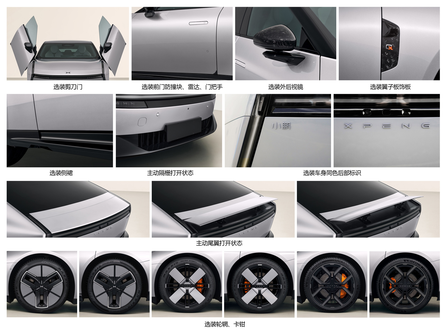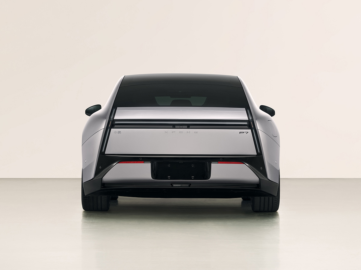 车尾部分,全新小鹏 P7 的尾部设计简洁凌厉,从选装配件上看新车可选多款轮辋、卡钳、剪刀门、主动尾翼。