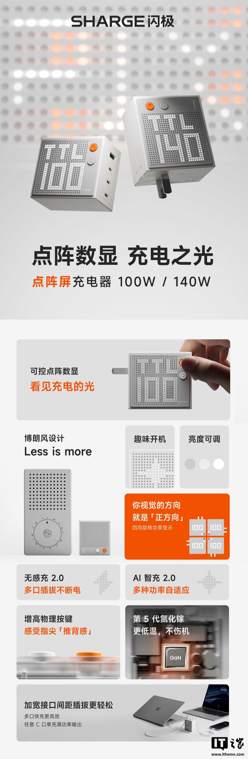 IT之家 5 月 23 日消息,闪极现已在京东上架一款“点阵屏充电头”,可选 100W 和 140W 两种版本,其中 100W 采用“3 个 USB-C 和 1 个 USB-A”规格,定价为 169 元;140W 采用 3 个 USB-C 规格,定价为 199 元。