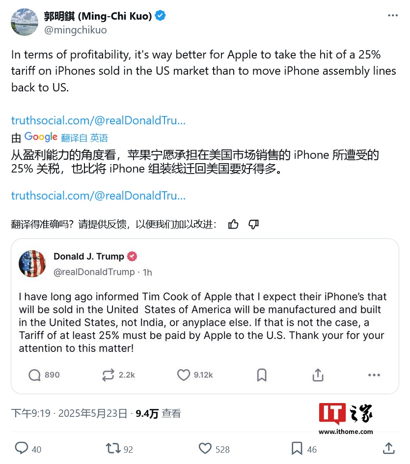 IT之家 5 月 24 日消息,天风国际证券分析师郭明錤昨日(5 月 23 日)在 X 平台发布推文,表示苹果公司在美国地区销售的 iPhone,即便遭遇 25% 进口关税的“定向打压”,其财务负担也远低于转移组装生产线至美国的成本。
