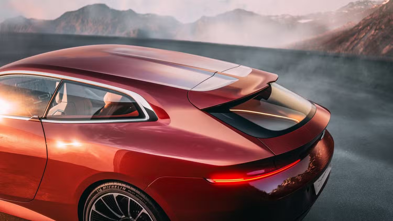 Speedtop 车顶表面延续引擎盖脊线,形成两侧雕刻式凹槽,流向尾部扰流板,并通过独特的双色渐变 / 渐变色调(Floating Sunstone Maroon 与 Floating Sundown Silver)。
