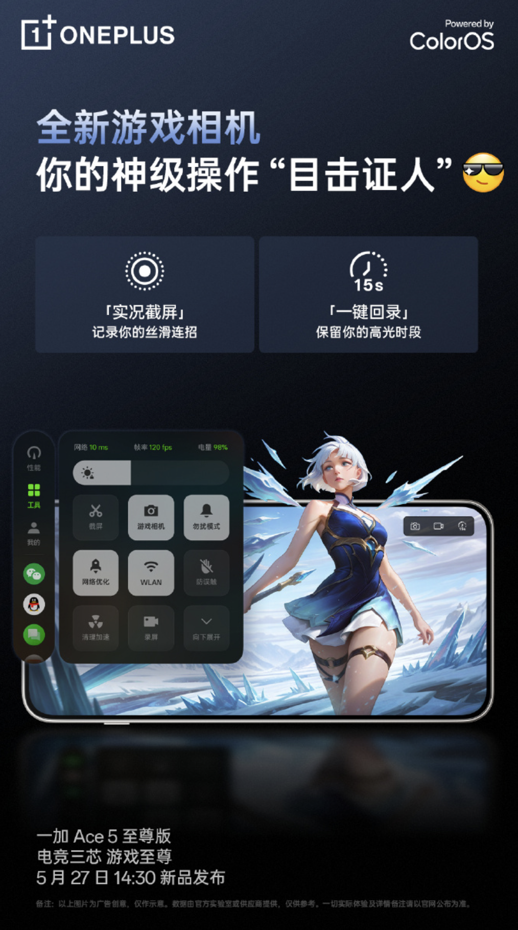 IT之家 5 月 24 日消息,“一加手机”官方微博今天对即将在 5 月 27 日发布的一加 Ace5 至尊版进行预热,透露这款手机将升级全新“游戏相机”功能,包含“实况截屏”和“一键回录”两大特性。