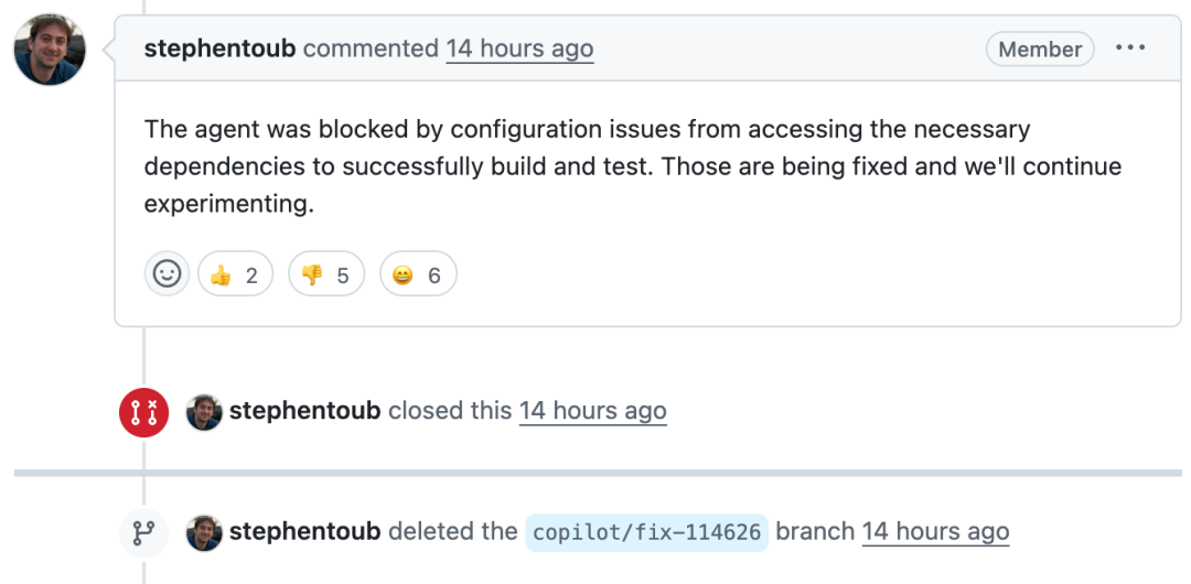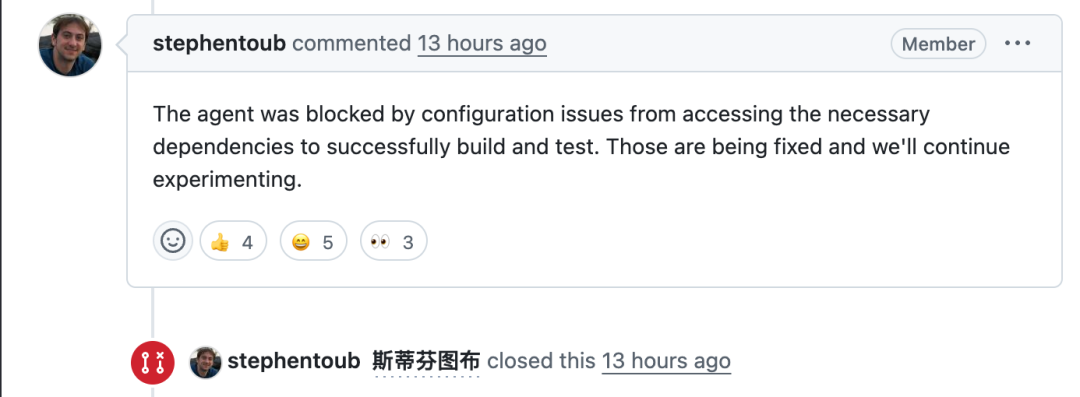 最终这条 PR 被斯蒂芬老哥手动关闭,他认为是由于配置问题,智能体无法访问所需的依赖项。