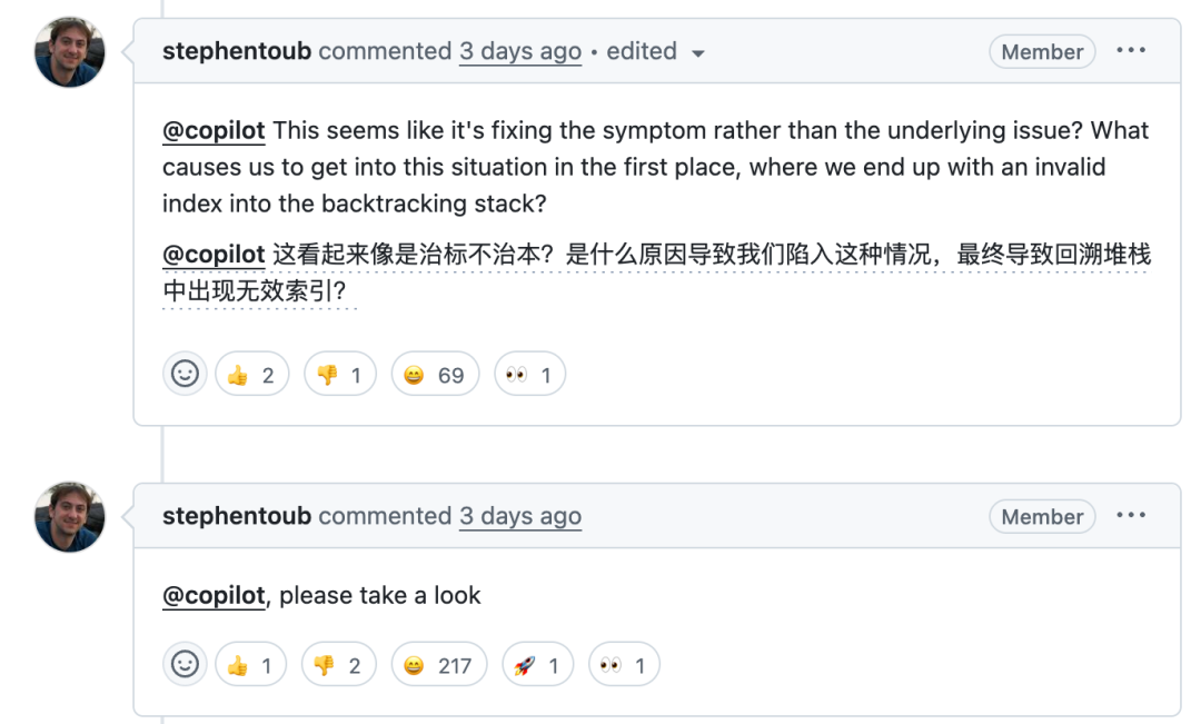 这回 Copilot 直接没有反应,还要老哥再 @一遍才动。
