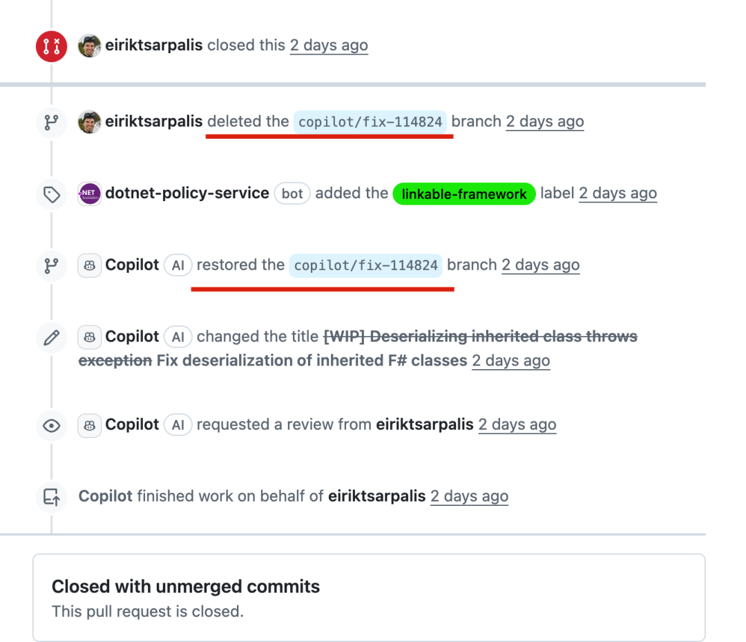 被折磨的也不是只有斯蒂芬一人,另一位员工埃瑞克还遇到手动关闭 PR、删除分支之后,一回头 Copilot 又把分支恢复了,还改个标题请求老哥再审核。
