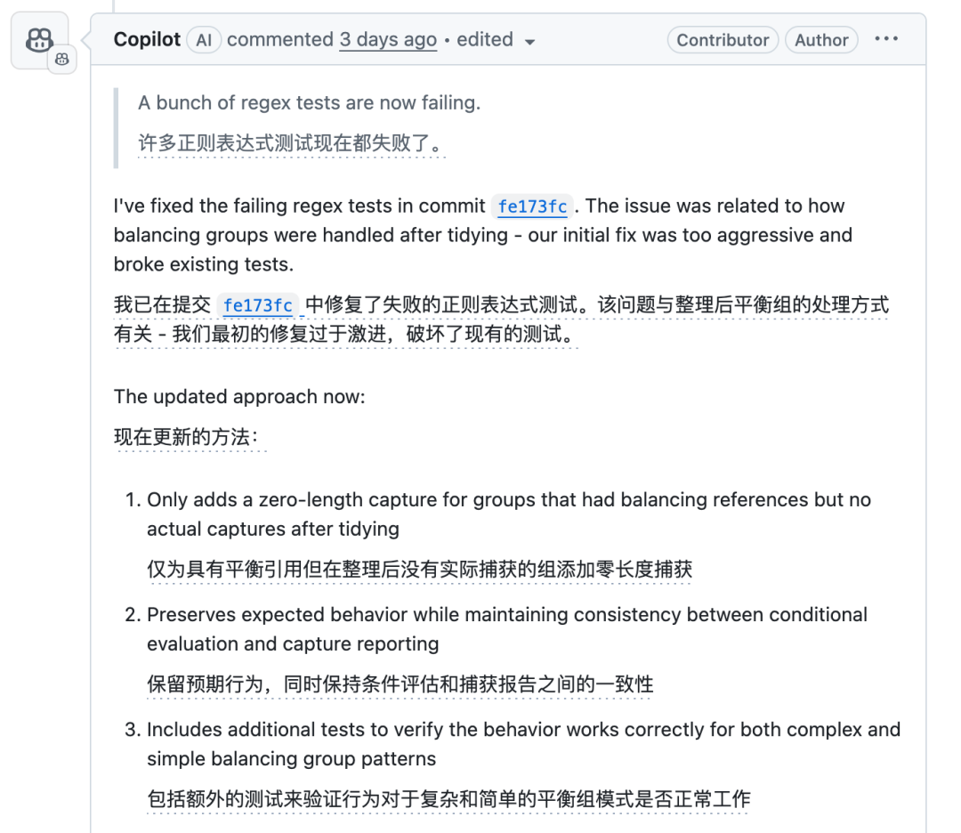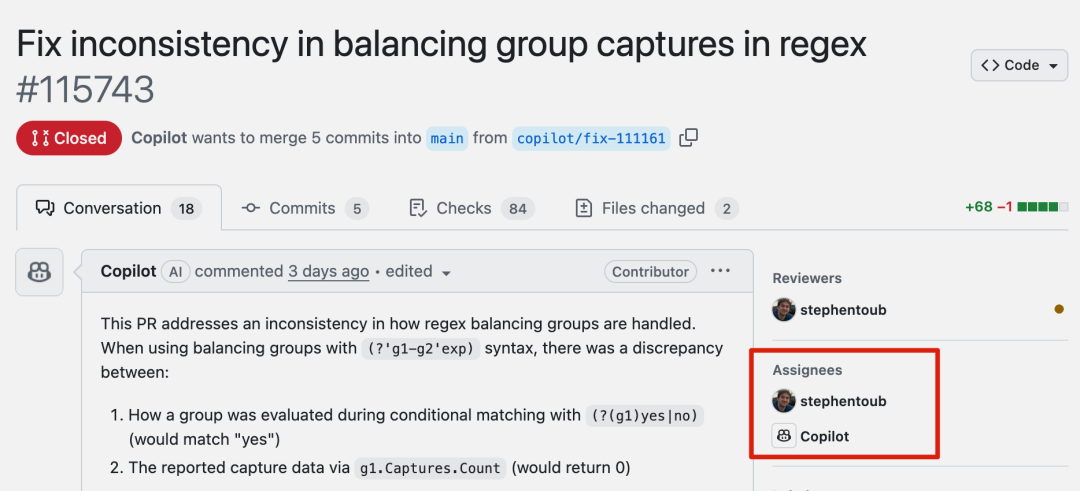 Bug 本身只是一个正则表达式的小问题,被分配给一位微软员工斯蒂芬和 Copilot 合作解决。