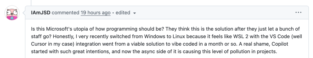 不过斯蒂芬老哥回复,使用 Copilot 不是公司强制性的要求,团队一直在实验 AI 工具以了解在当前和未来的局限性。