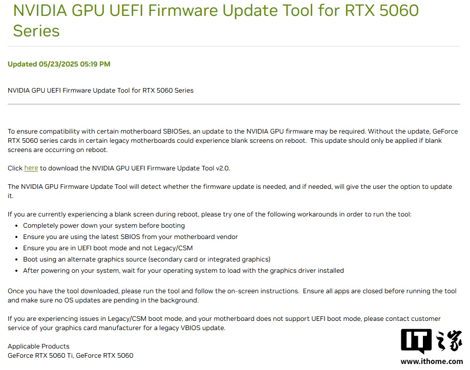 IT之家 5 月 24 日消息,英伟达于当地时间 23 日发布公告,宣布针对 RTX 5060 系列显卡推出 UEFI 固件更新工具 v2.0,以解决部分机型出现黑屏与重启问题。