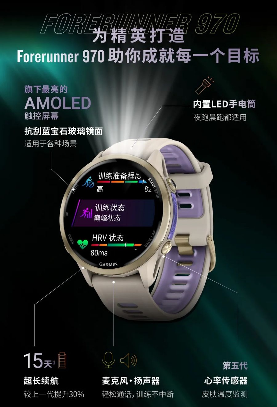 Forerunner 970 在材质和功能上明显领先,采用钛金属表圈和蓝宝石镜面,并是首款搭载 LED 手电筒的 Forerunner 系列手表,支持四档调节,双色光源,在佩戴者晨跑或者夜练时通过频闪提高户外跑步安全。