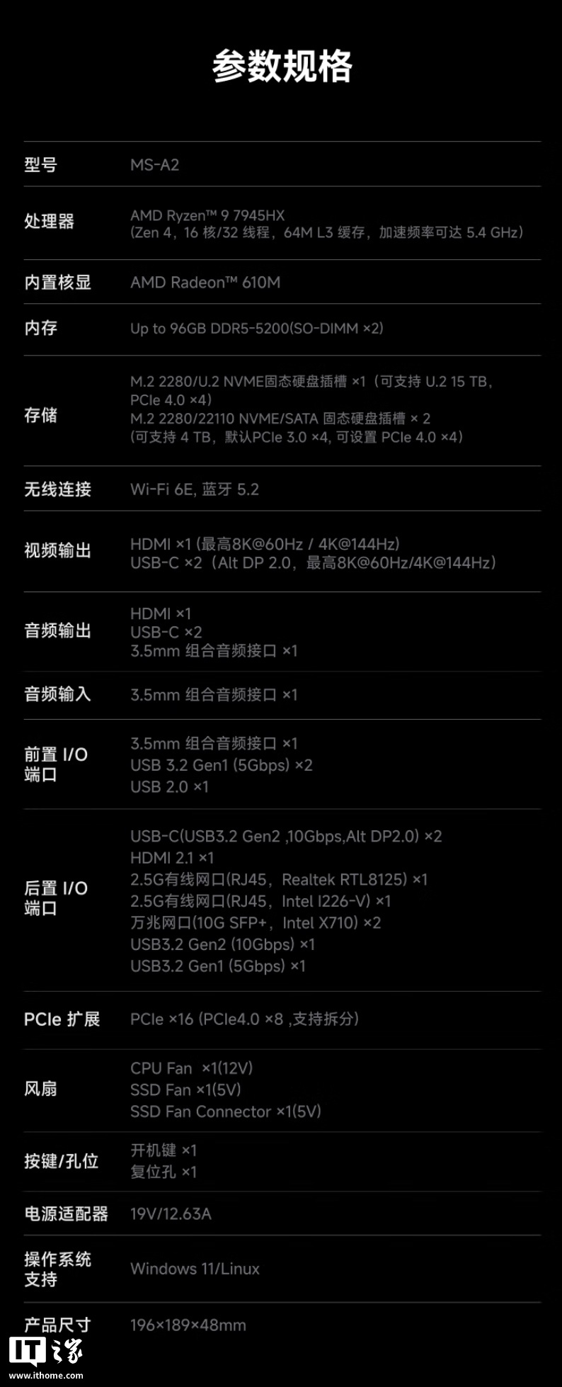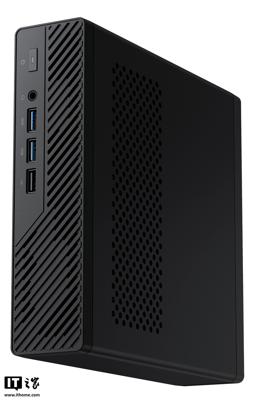 该机尺寸为 196×189×48 (mm),体积 1.78L,重 1.4kg,采用 DC-in 外置适配器供电。该机型拥有一条 Gen4 ×8 带宽的全长 PCIe 插槽,可用于安装单槽半高 AIC。