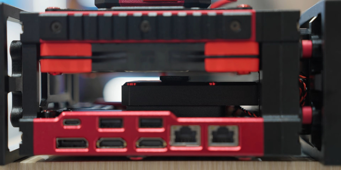 这款小主机搭载 AMD R7 8845HS 处理器,采用红黑配色 + 开放式机箱设计,体积仅有 1L 左右。