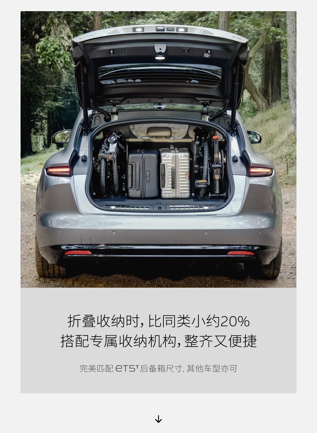 据介绍,这款产品采用了新 ET5T 的主打色“月辉银”加上“气辉橙”点缀,并且原生适配新 ET5T 的后备箱。该产品尺寸超小,比传统的折叠车小超过 20%,而且配合蔚来专属的停放机构,可以平推放入 ET5T 的后备箱。