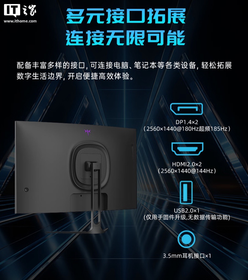 这款显示器支架支持升降 / 倾斜 / 旋转,显示器本体支持 VESA 壁挂,提供 2 个 DP 1.4(185Hz)、2 个 HDMI 2.0(144Hz)、1 个 3.5mm 音频接口。