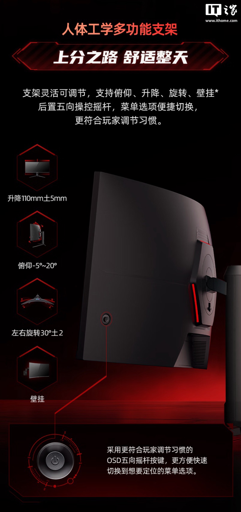 该机支架支持升降 / 倾斜 / 旋转,显示器本体支持 75mm x 75mm 壁挂,提供 2 个 HDMI 2.0、1 个 DP 1.4、1 个 3.5mm 音频接口。