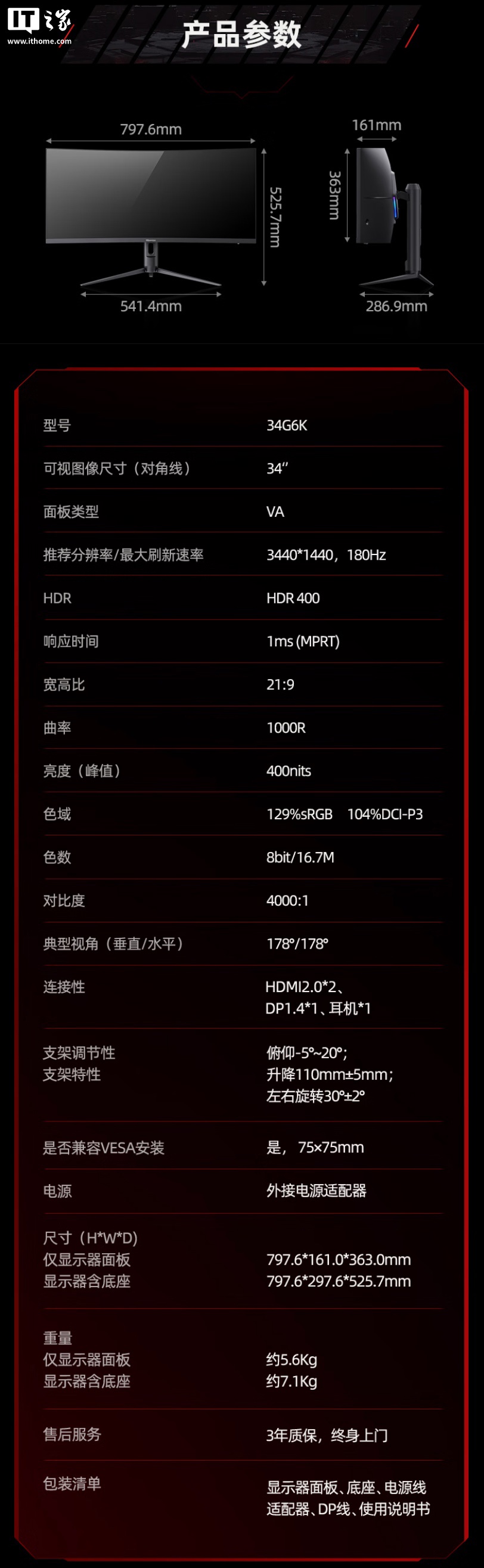 该机配备一块 34 英寸 21:9 比例 3440 x 1440 分辨率 180Hz VA 面板,显示器静态对比度 4000:1,曲率 1000R,峰值亮度 400 尼特,MPRT 响应速度 1ms,显示器支持 8-Bit 色彩,覆盖 129% sRGB 和 104% DCI-P3 色域。