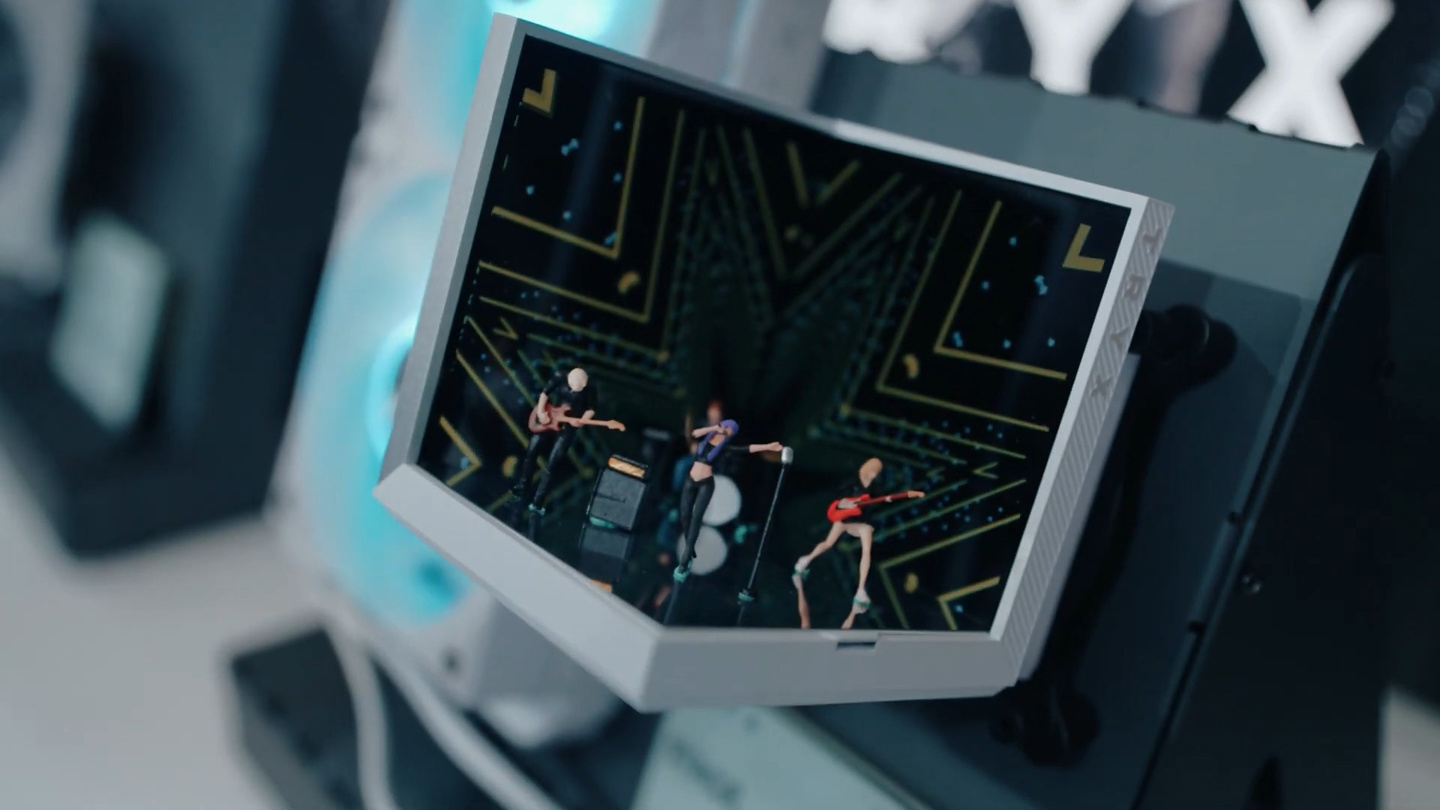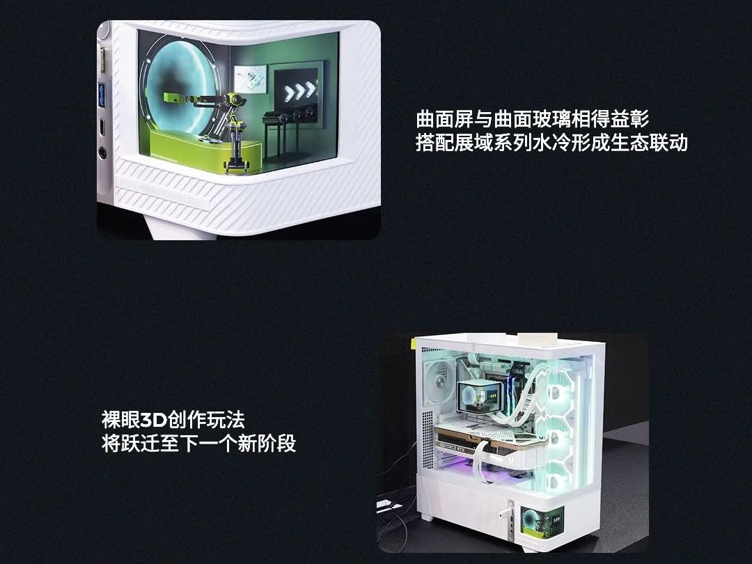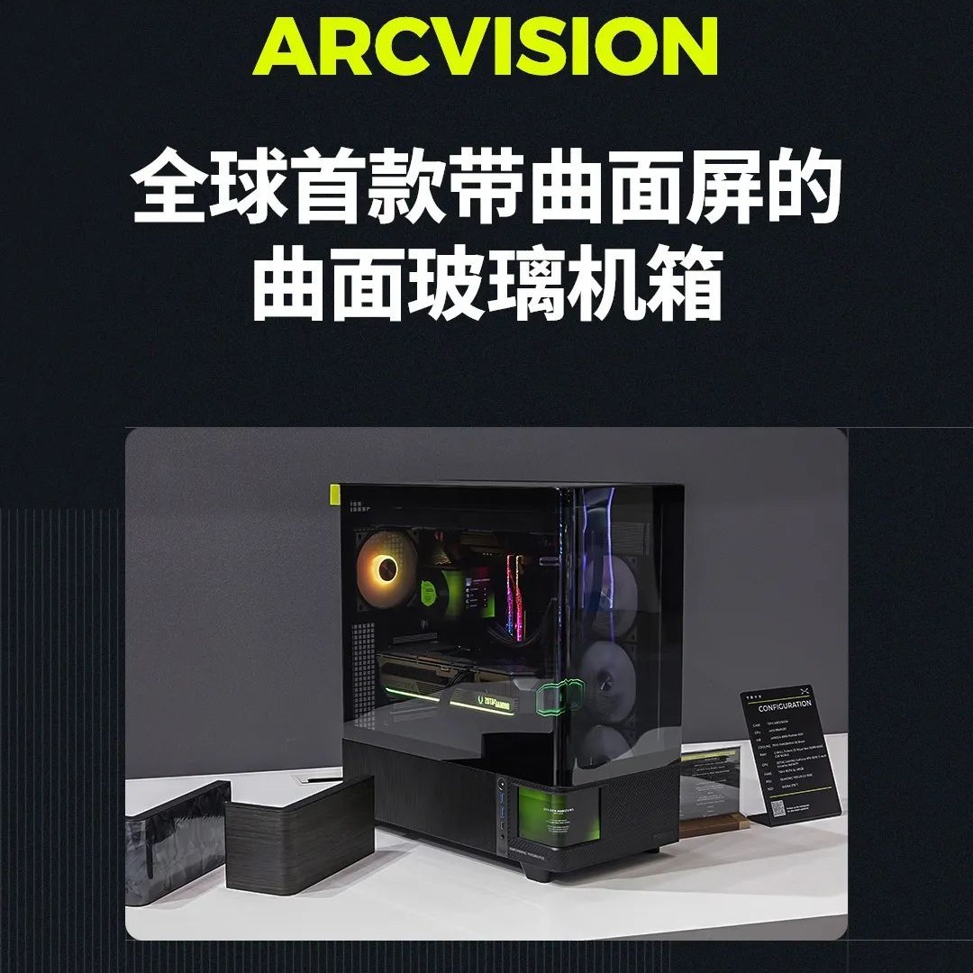 而在机箱方面,TRYX 则推出了号称“全球首款带曲面屏的曲面玻璃机箱”ARCVISION。这一产品在前左角下部搭载了一块支持裸眼 3D 显示的曲面屏,与上方的曲面玻璃相得益彰,也可与展域系列水冷生态联动。