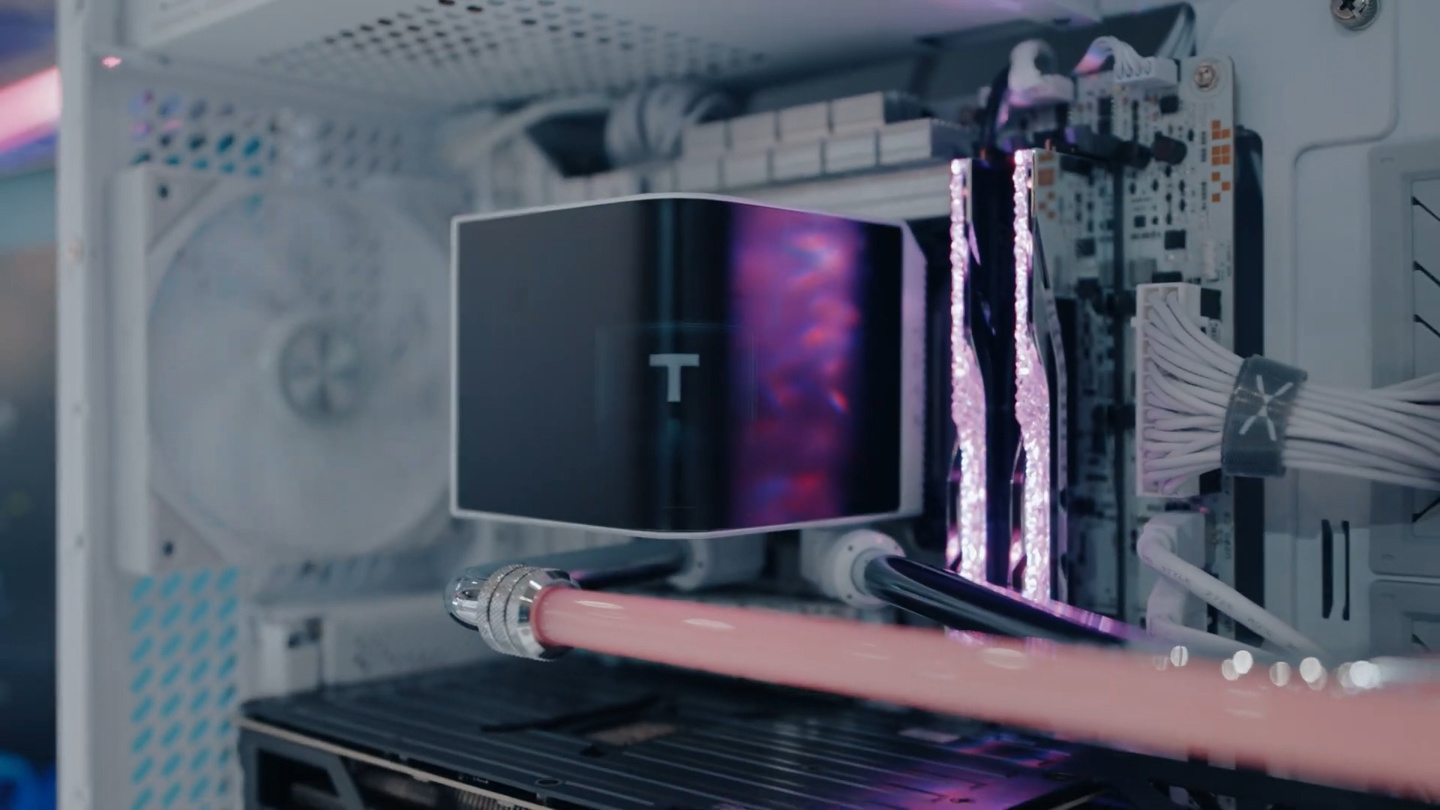 TRYX 在 COMPUTEX 2025 上的主打产品是 STAGE 一体式处理器水冷,这一散热器的冷头配备了两块内凹的 L 型 4 英寸显示面板,结合下方的镜面形成创意“舞台”结构。而在冷却性能方面 STAGE 水冷基于 Asetek 方案。