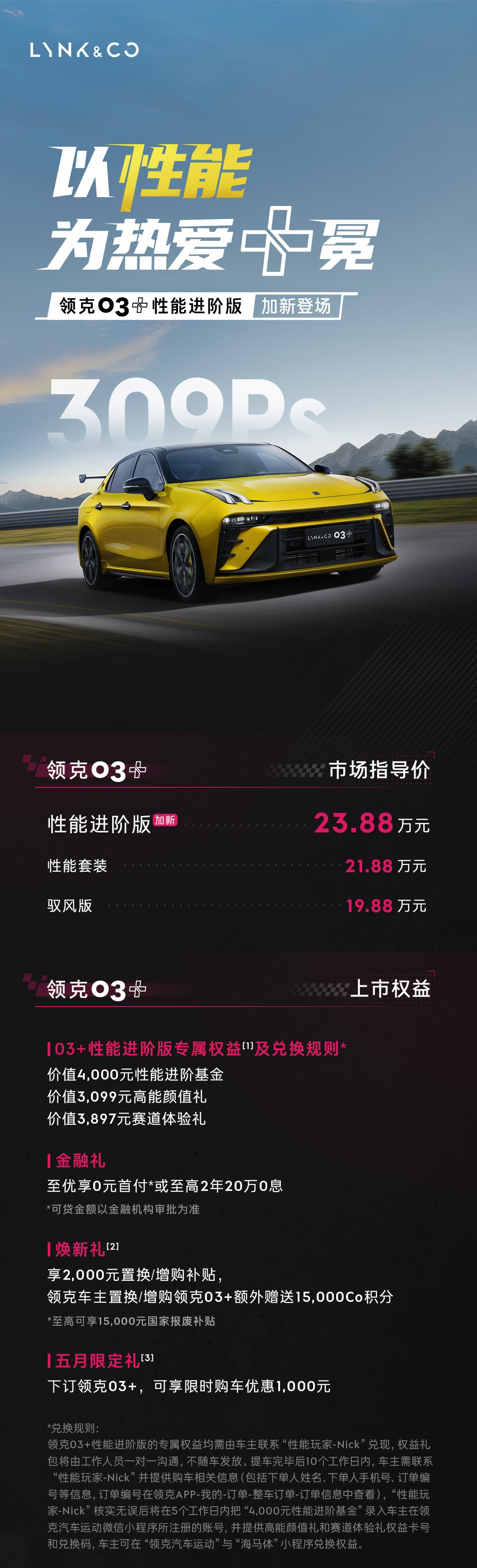 IT之家 5 月 26 日消息,领克 03 + 性能进阶版今日正式上市,售价为 23.88 万元。新车搭载了领克 03+TCR Cyan 版发动机,最大功率 309 马力,0-100km/h 加速时间仅为 5.4 秒。
