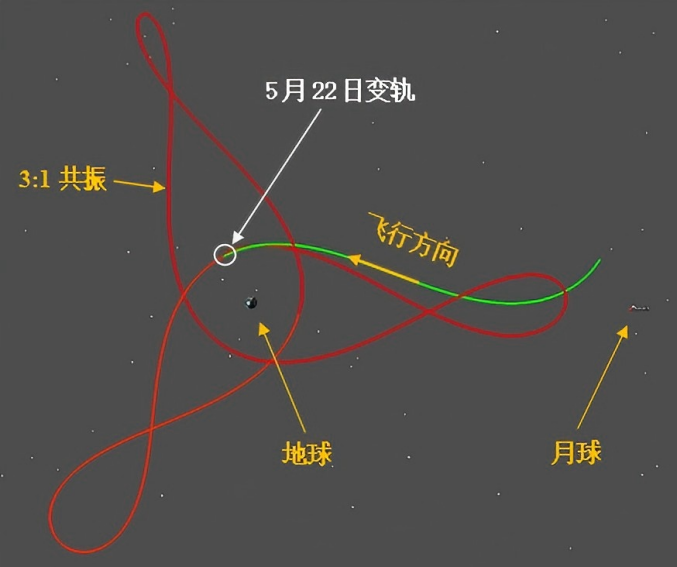 地月空间 3:1 共振轨道具有特殊的轨道力学特性,探测器在此轨道运行期间每绕地球三圈即与月球完成一次轨道共振。该轨道具备周期性在地球和月球之间往返的特性,且维持能耗需求低,对未来地月空间开发与基础设施建设等具有重要意义。