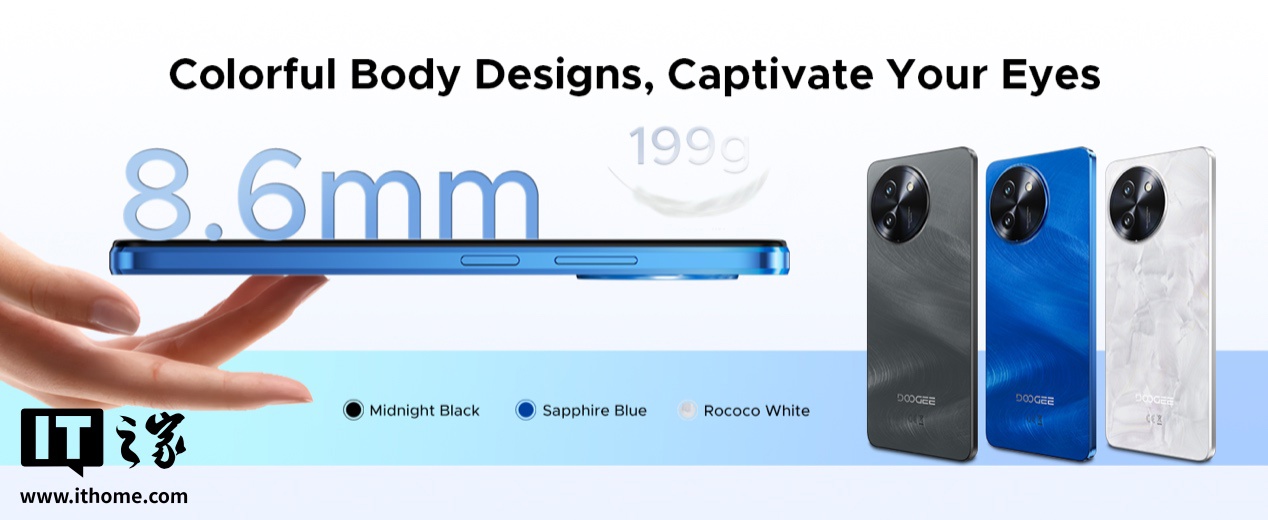 Note 59 Pro + 机身采用金属边框,官方称正面玻璃坚韧度提升十倍,整机重量 199g、厚度 8.6mm,提供黑、蓝、白三种配色,搭载 6.75 英寸 720P IPS 显示屏,120Hz 刷新率,峰值亮度 450nit。