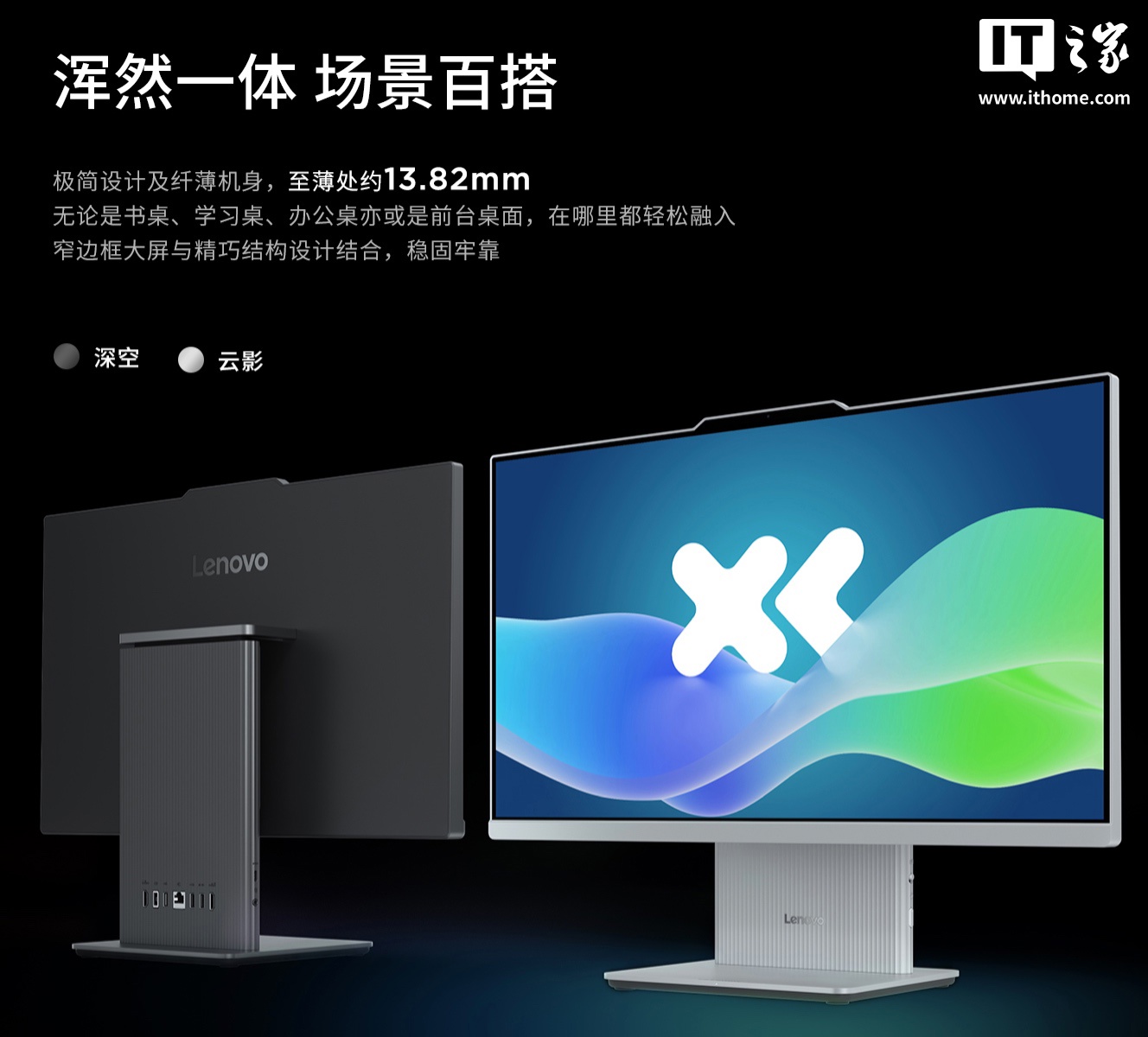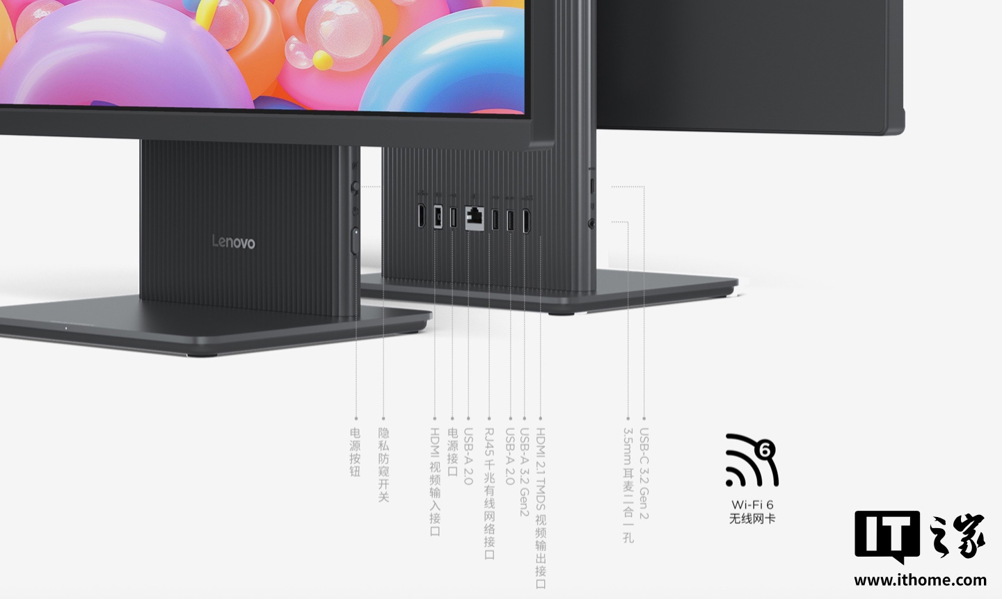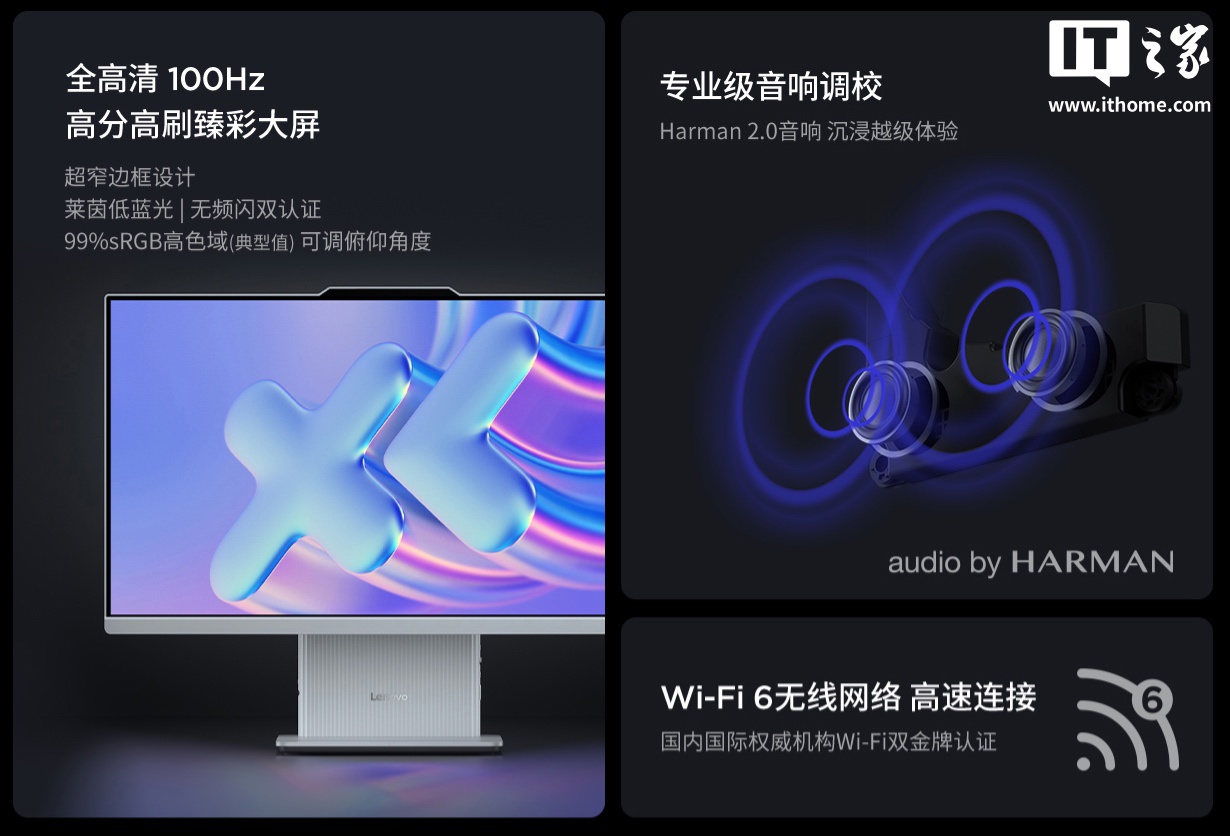 该机继承了家族式简约设计,暂仅可选黑色配色,配备 Harman 2.0 立体声音响、语音降噪双麦克风,支持莱茵低蓝光及无频闪认证,支持 Wi-Fi 6 无线网络。