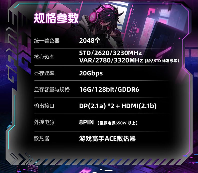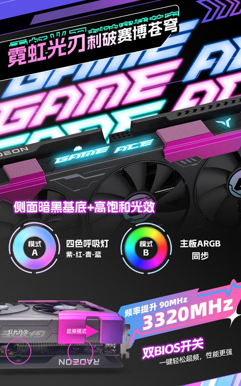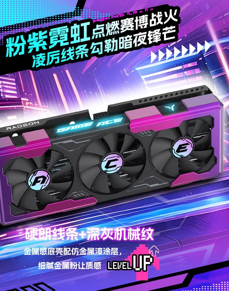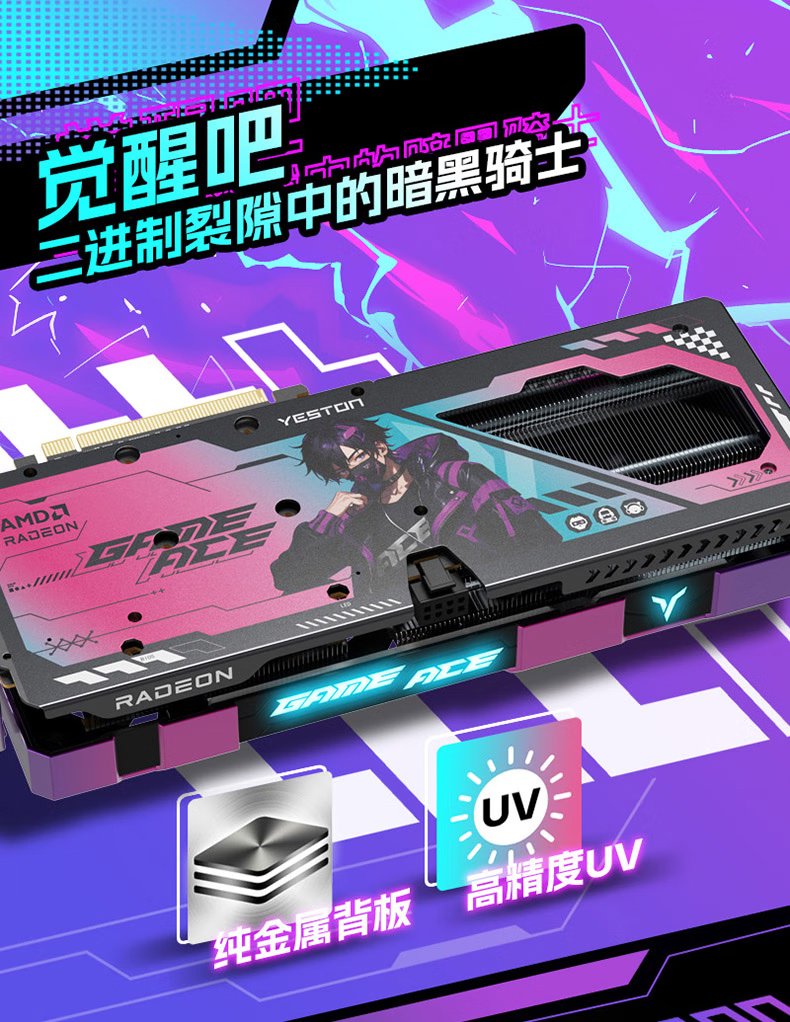 RX 9060 XT 16GB 游戏高手 ACE OC 整体方正,正面在金属质感机械纹底壳上配以粉紫霓虹装饰块;侧面则是 "Game Ace" + 盈通标志双灯区;此外该显卡配备一块印有主题人物形象的 UV 彩绘金属背板。