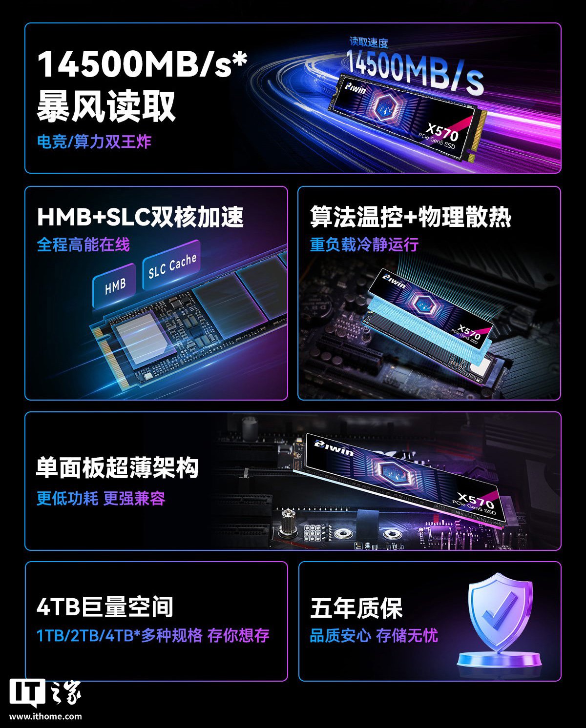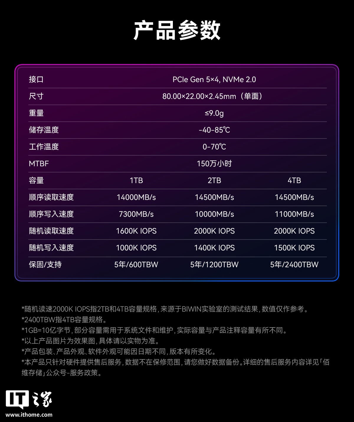 佰维 X570 可选 1TB、2TB、4TB 三种容量版本,顺序读写分别至高可达 14500 MB/s 和 11000 MB/s,随机读写分别至高可达 2000K IOPS 和 1400K IOPS,享受 5 年每 TB 容量 600TBW 的质保。