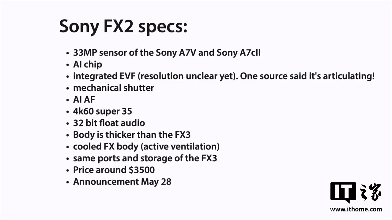 IT之家 5 月 27 日消息,索尼官宣将于 5 月 28 日(明天)晚上 10 点公布新品电影机,参考IT之家此前报道,预计索尼届时将发布 FX2 电影机,主打影视学生和内容创作者市场,定价有望为 3500 美元(IT之家注:现汇率约合 25138 元人民币)。
