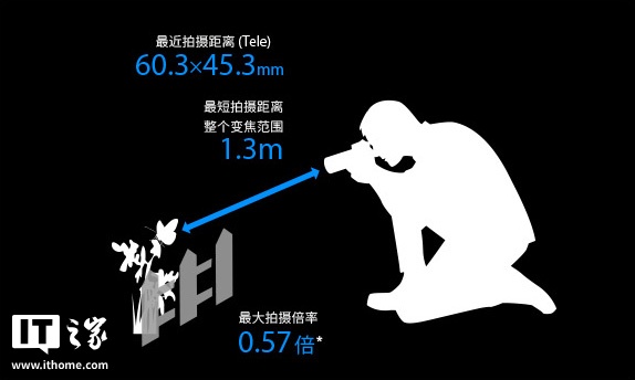该镜头整个变焦范围内的最短拍摄距离为 1.3m,可进行最大拍摄倍率等效 0.57 倍(长焦端最近拍摄范围 60.3×45.3mm)的近拍。
