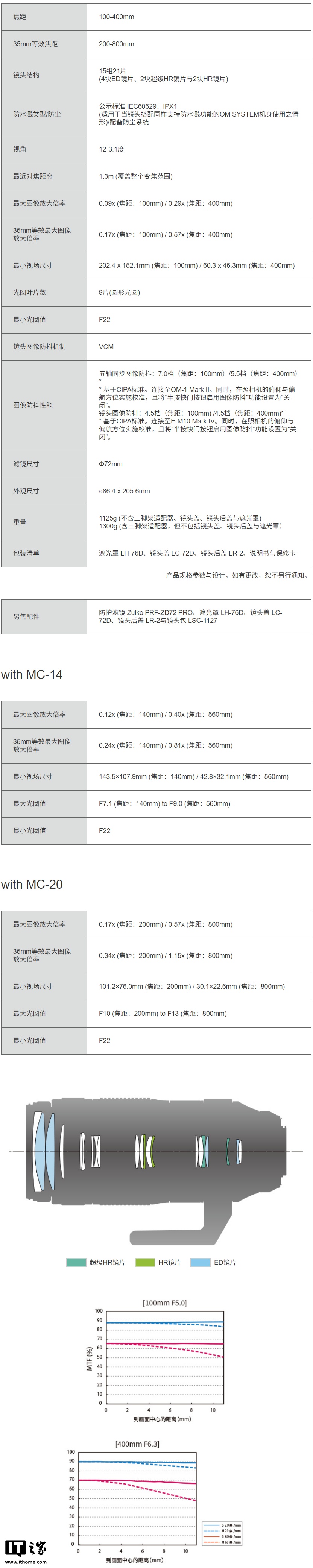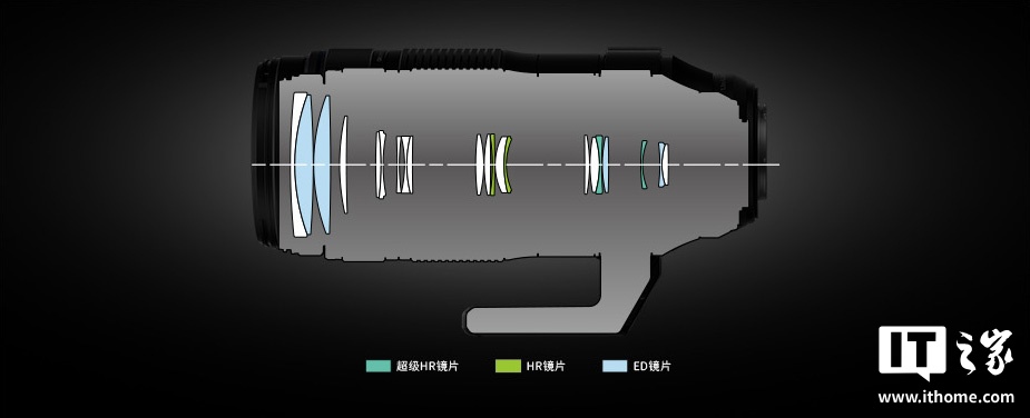 IT之家查询奥之心官网获悉,该镜头使用了 4 片 ED 镜片来减少超长焦镜头中常见的的色斑。此外还使用了超级 HR(Super High Refractive index Super High Refractive index)镜片和 HR 镜片(High Refractive index)。