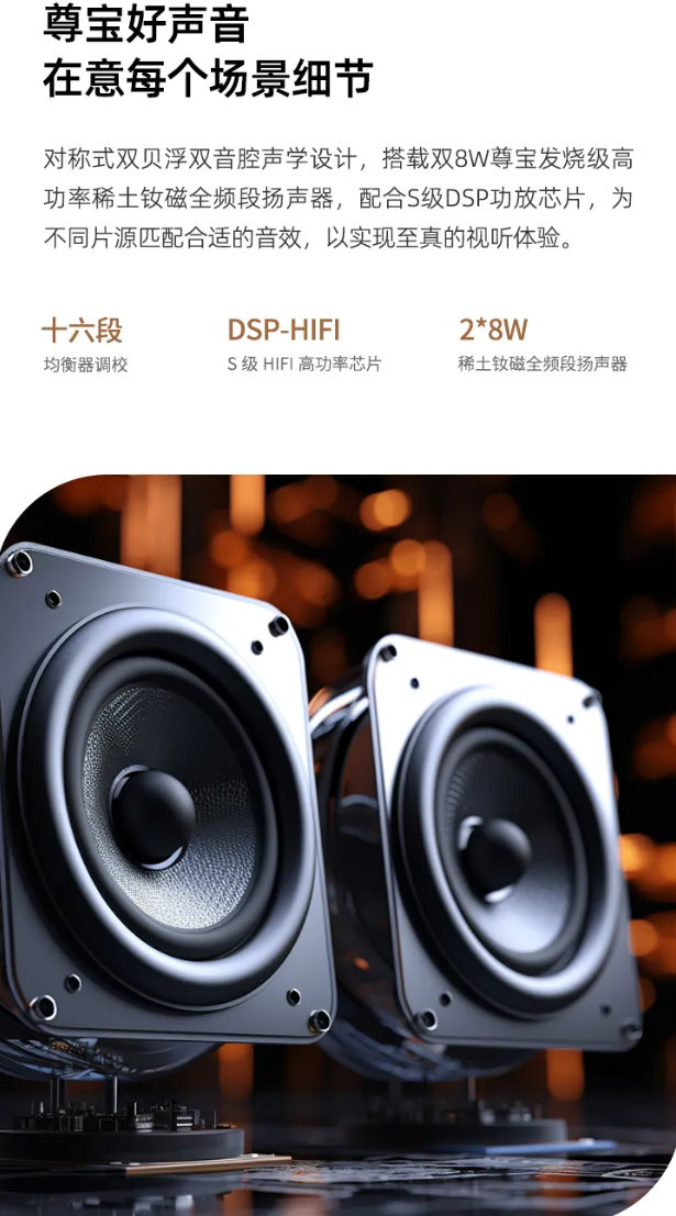 该投影仪采用对称双贝浮双音腔声学设计,搭载双 8W 全频段扬声器和 S 级 DSP 功放芯片,支持十六段均衡器调校。