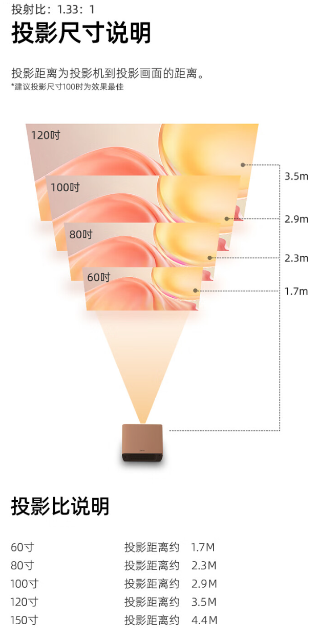 知麻 Z2 MINI 投影仪支持 1.33:1 投射比,最大可投 150 寸画面。投射尺寸说明及参数信息如下: