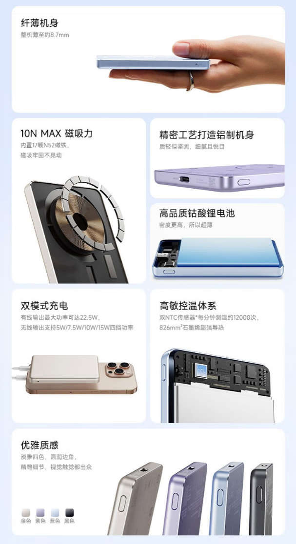 据介绍,这款新品提供蓝色、黑色、紫色、金色四款配色,具有 8.7mm 超薄机身,厚度降低约 27.5%。内置一颗 5000mAh 电池,能量密度提升约 12.9%,300 次循环后容量仍保持约 80% 以上。