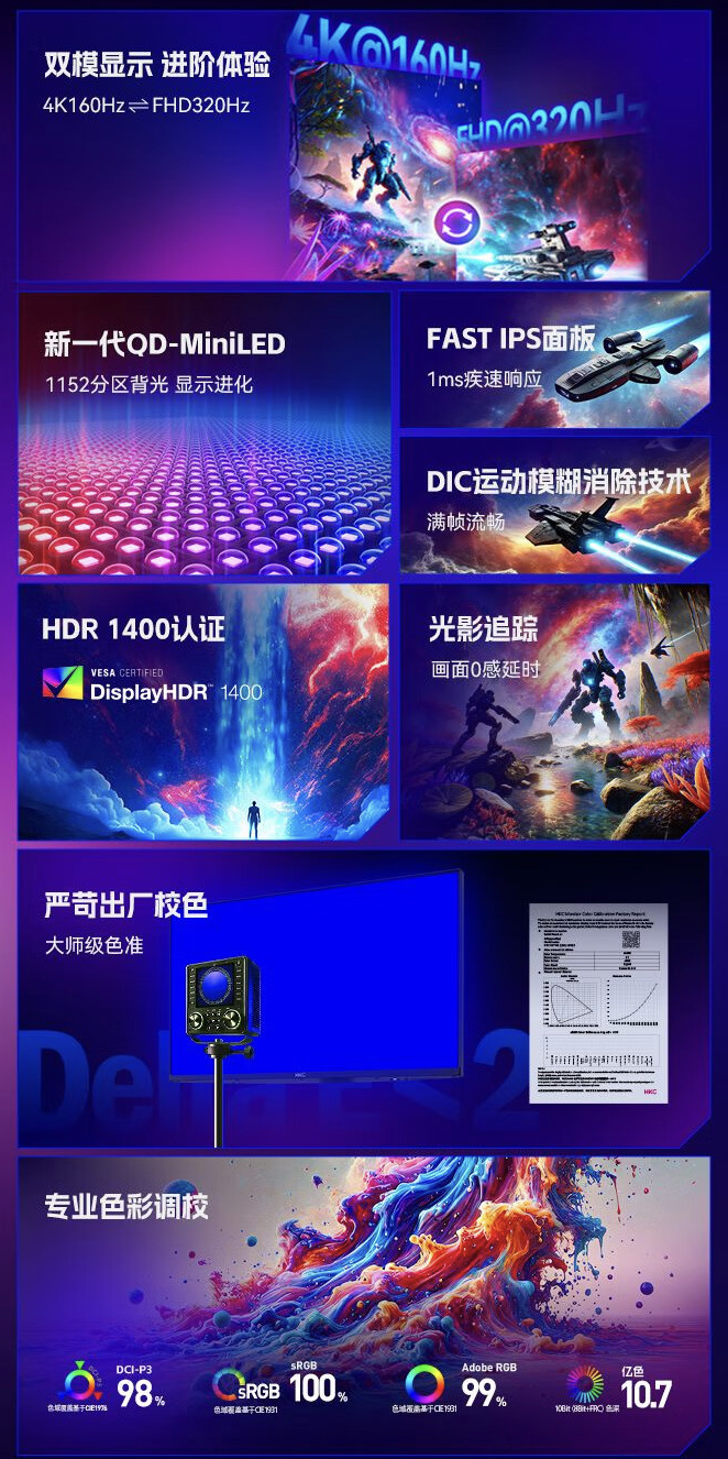 这款显示器配备的 QD-Mini LED 面板支持以 3840x2160 分辨率 160Hz 或 1920x1080 分辨率 320Hz 两种方式显示,其拥有 1152 分区背光,动态对比度 100 万:1,亮度 1400 尼特,支持 10-Bit 色彩(8-Bit + FRC),覆盖 98% DCI-P3、100% sRGB、99% Adobe RGB 色域。