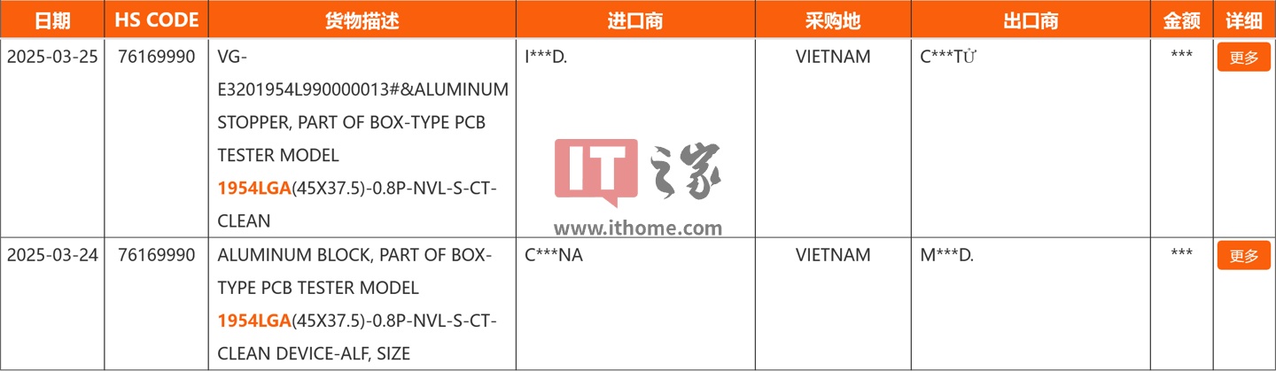 IT之家 5 月 29 日消息,根据第三方海关仓单数据平台 NBD 纽佰德的记录,英特尔下代新架构 MSDT 级处理器 "Nova Lake-S" 采用的 FCLGA1954 插槽封装尺寸将维持与 Socket V 插槽家族“两兄弟”FCLGA1700、FCLGA1851 相同的 45×37.5 (mm)。