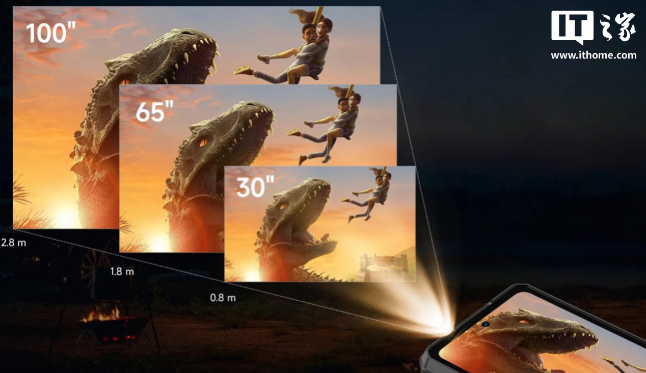值得注意的是,该三防手机还内置 DLP 投影仪,DMD 芯片尺寸为 0.2 英寸,可投射 854x480 分辨率最大 100 英寸的画面,透射比 1.3:1,不过 150 流明的亮度令大尺寸投影实用性存疑,手机可平置进行投影,并支持梯形校正和自动对焦。