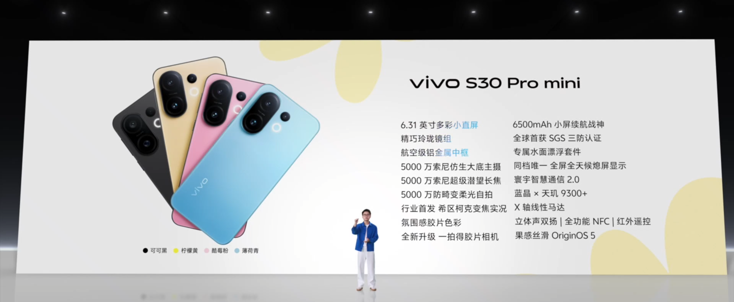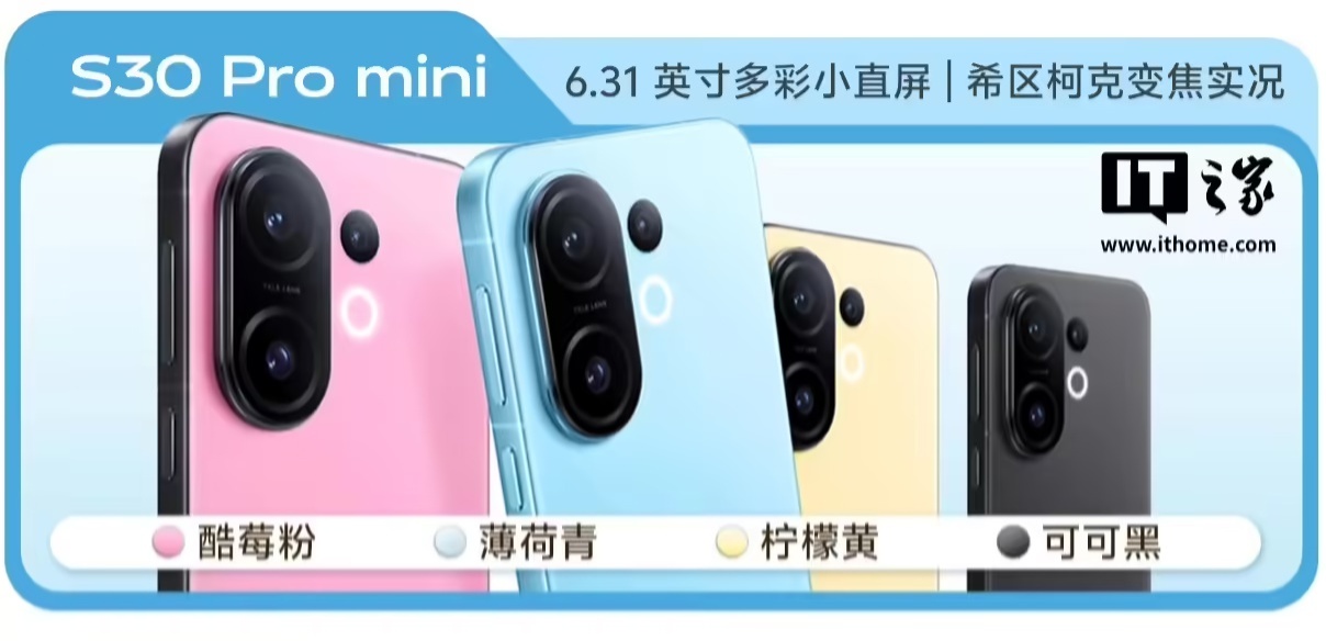 vivo S30 Pro mini 手机将提供酷莓粉、薄荷青、柠檬黄、可可黑四款配色,定位 6.31 英寸多彩小直屏,支持希区柯克变焦实况。