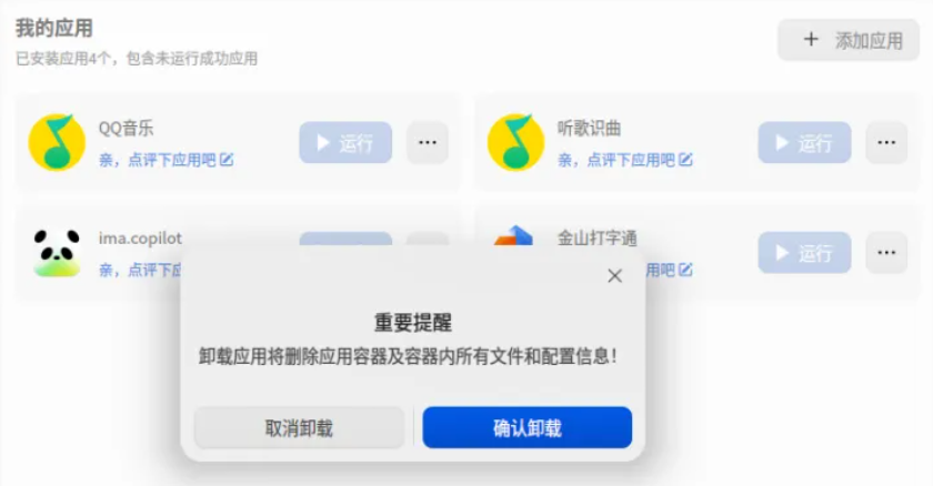 本次更新为“我的应用”中的应用卸载 / 删除操作增加了弹窗提醒,减少误操作,并对不同容器状态进行差异化处理: