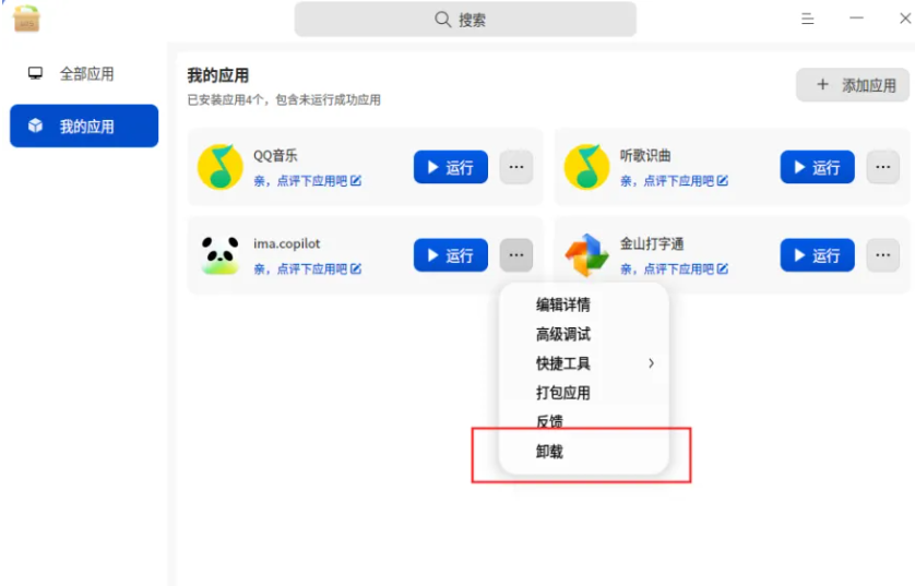安装完成后,应用将出现在“我的应用”中,可在此或“全部应用”列表内启动、调试或卸载。如果当前安装的应用缺少依赖,安装面板会提示缺失项,只需按照提示安装依赖即可。